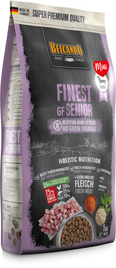 Die besonders schmackhafte Alternative für ältere Hunde mit Sensitivität auf Getreide. Beste Rohstoffe wie Amaranth, nährstoffreicher Krill und extra viel frisches Geflügel versorgen den Vierbeiner mit allem, was er im fortgeschrittenen Alter benötigt. Erlaubt zudem die Umstellung von unseren Finest GF-Sorten auf eine altersgerechte Ernährung des kleinen Seniors in gewohnt hochwertiger Rezeptur ohne Getreide.