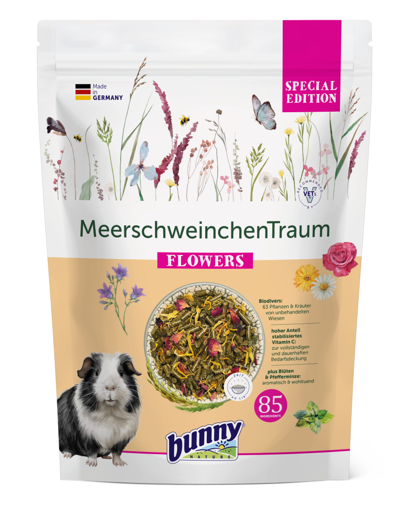 SPECIAL EDITION FLOWERS bietet Meerschweinchen eine außergewöhnliche Auswahl an hochwertigen Zutaten, die speziell auf die ernährungsphysiologischen Bedürfnisse abgestimmt sind. Neben einem hohen Anteil an stabilisiertem Vitamin C, um eine vollständige Bedarfsdeckung sicherzustellen, enthält dieses Alleinfuttermittel eine Vielzahl von Blüten und Pfefferminze, die nicht nur für einen aromatischen und wohltuenden Genuss sorgen, sondern auch wichtige Nährstoffe und sekundäre Pflanzenstoffe liefern. SpecialEdition Flowers ist mehr als nur Futter - es ist eine tägliche Quelle der Freude und des Wohlbefindens für alle Meerschweinchen.