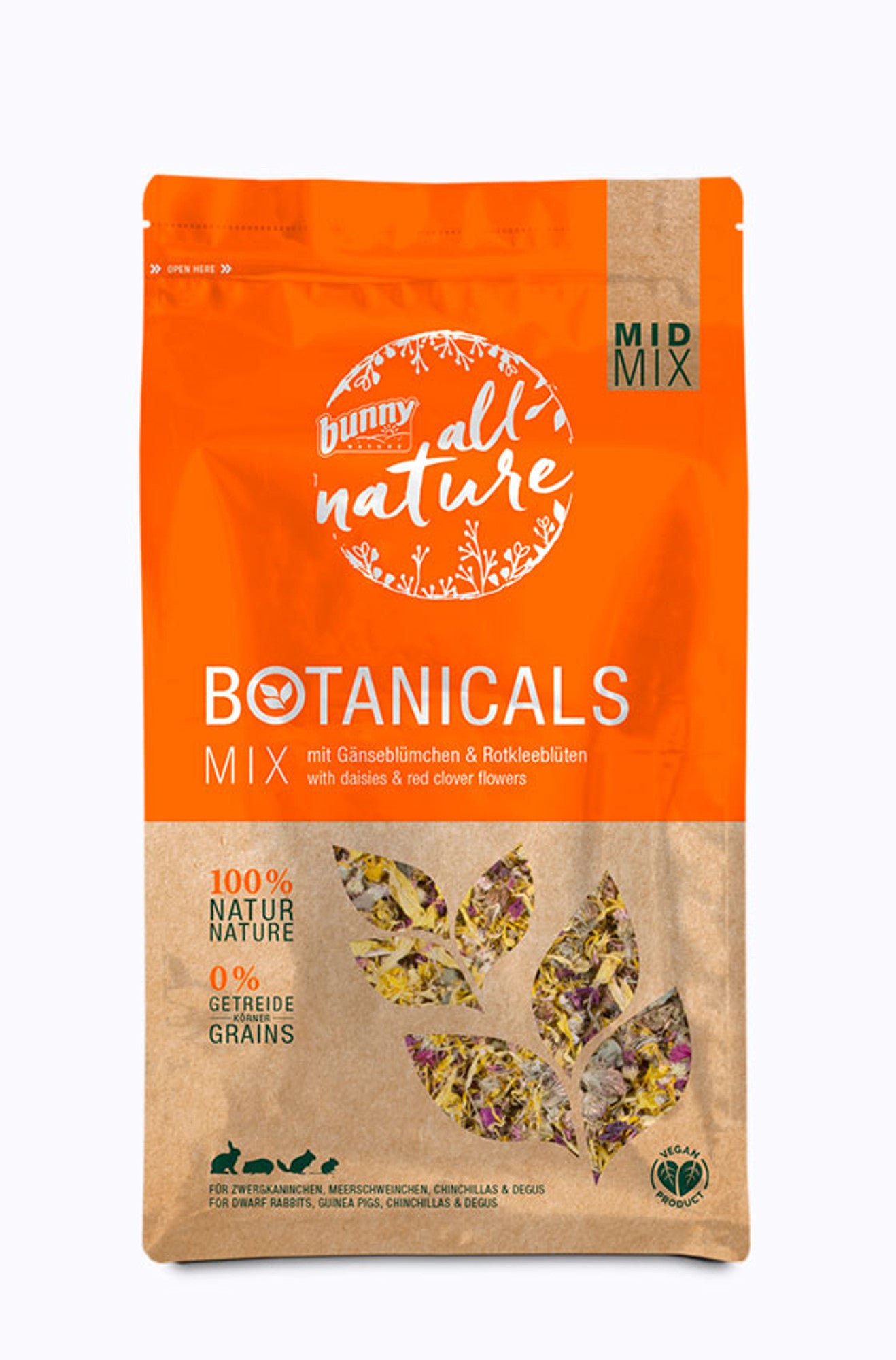 BOTANICALS MID MIX – mit Gänseblümchen & Rotkleeblüten ist ein natürlicher Kräutermix für Kaninchen und Kleintiere. Die Kombination aus fünf verschiedenen Blüten und Blumen, darunter Gänseblümchen und Rotkleeblüten, macht diesen Snack nicht nur optisch attraktiv, sondern auch besonders schmackhaft und angenehm zum Kauen.