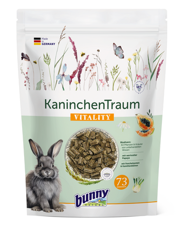 KaninchenTraum VITALITY ist ein Alleinfuttermittel für Kaninchen, das eine harmonische Mischung aus 63 Pflanzen & Kräutern von unbehandelten Wiesen bietet. Angereichert mit wertvoller Papaya, Fenchelsamen & Kamillenblüten, fördert es eine gesunde Darmflora und unterstützt Haut & Fell. Die balancierte Long-Life-Rezeptur gewährleistet, dass alle Komponenten richtig dosiert sind, und der 3-Faser-Mix sowie das optimale Rohfaser-Stärke-Verhältnis unterstützen das Optimalgewicht.