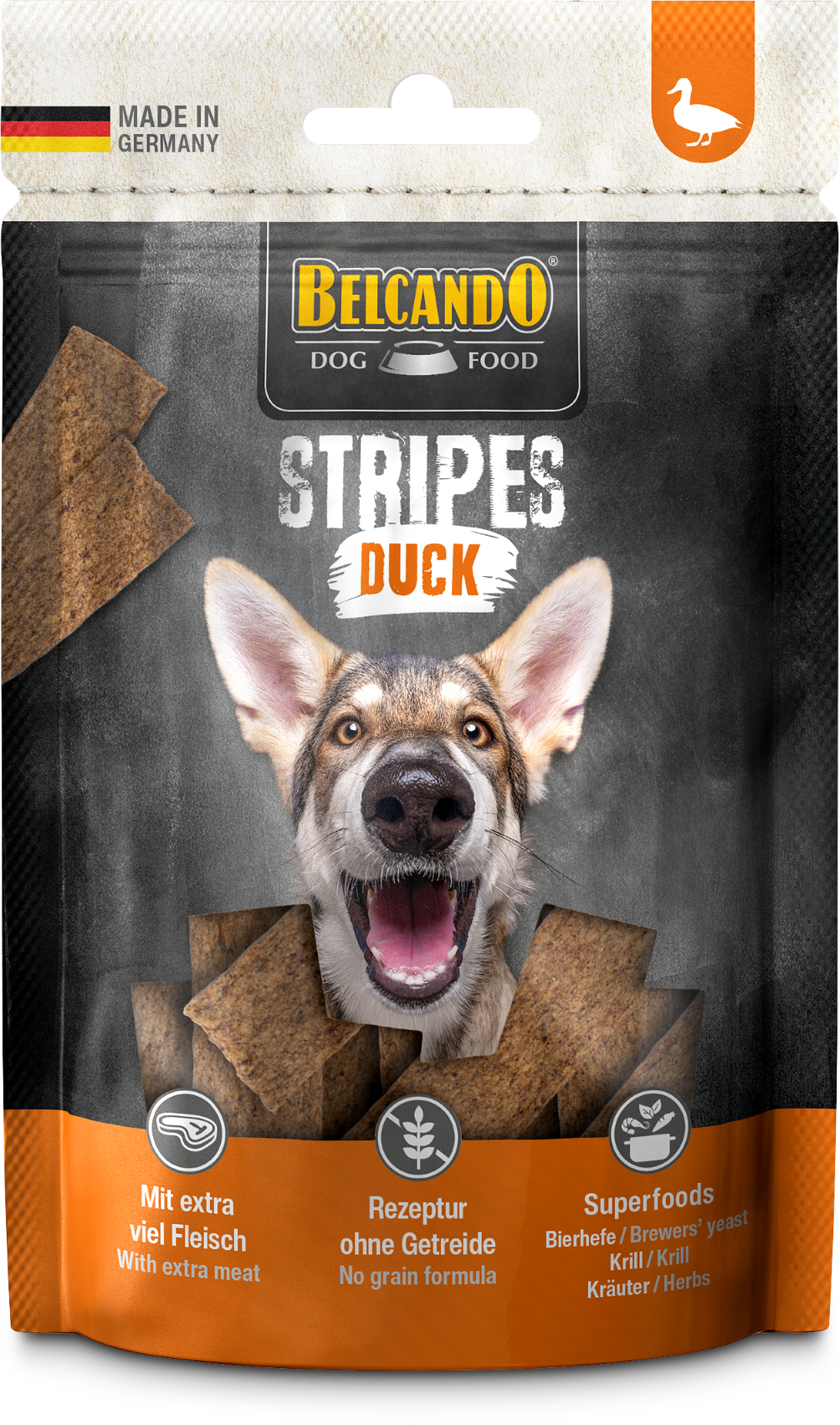 Krillen und Chillen! Schon Huhn allein sorgt für Gaumenfreude beim Kauen. Krill liefert sogar noch eine zusätzliche Ladung Power aus dem Meer – für mehr Wohlbefinden und Vitalität! Abgerundet wird das Snack-Erlebnis mit nähr- und vitalstoffreicher Bierhefe sowie aromatischen Kräutern für noch mehr Geschmack. Die Stripes sind natürlich „Made in Germany“ mit extra viel Fleisch und werden schonend luftgetrocknet. Die Rezeptur verzichtet auf Getreide und als praktische Streifen lassen sich die Snacks ganz einfach individuell portionieren. Diese getreidefreien Hundesnacks sind das ideale Hundeleckerlie für sensible Hunde oder solche mit Allergien. Perfekt als Trainingssnack oder als Belohnung zwischendurch!