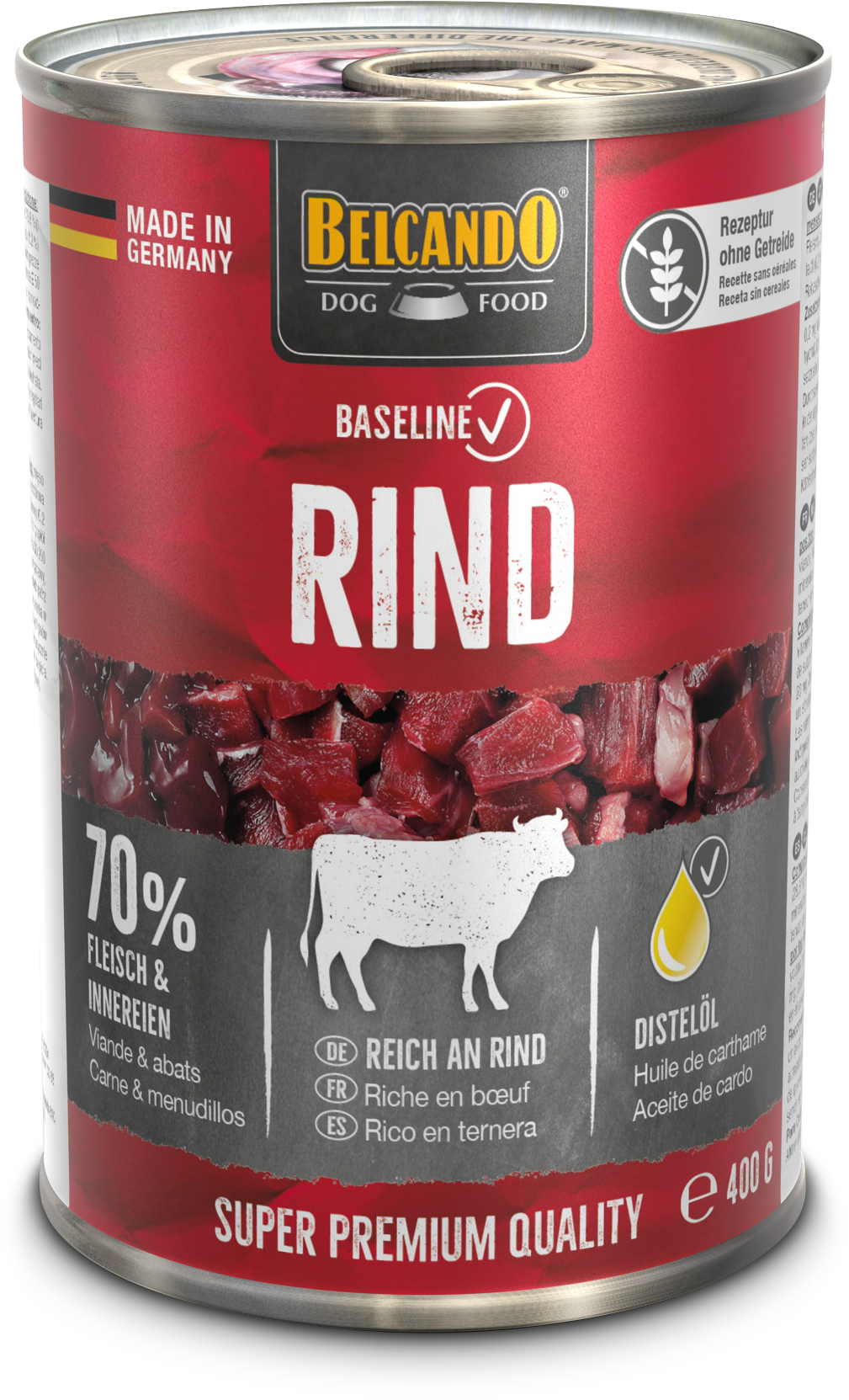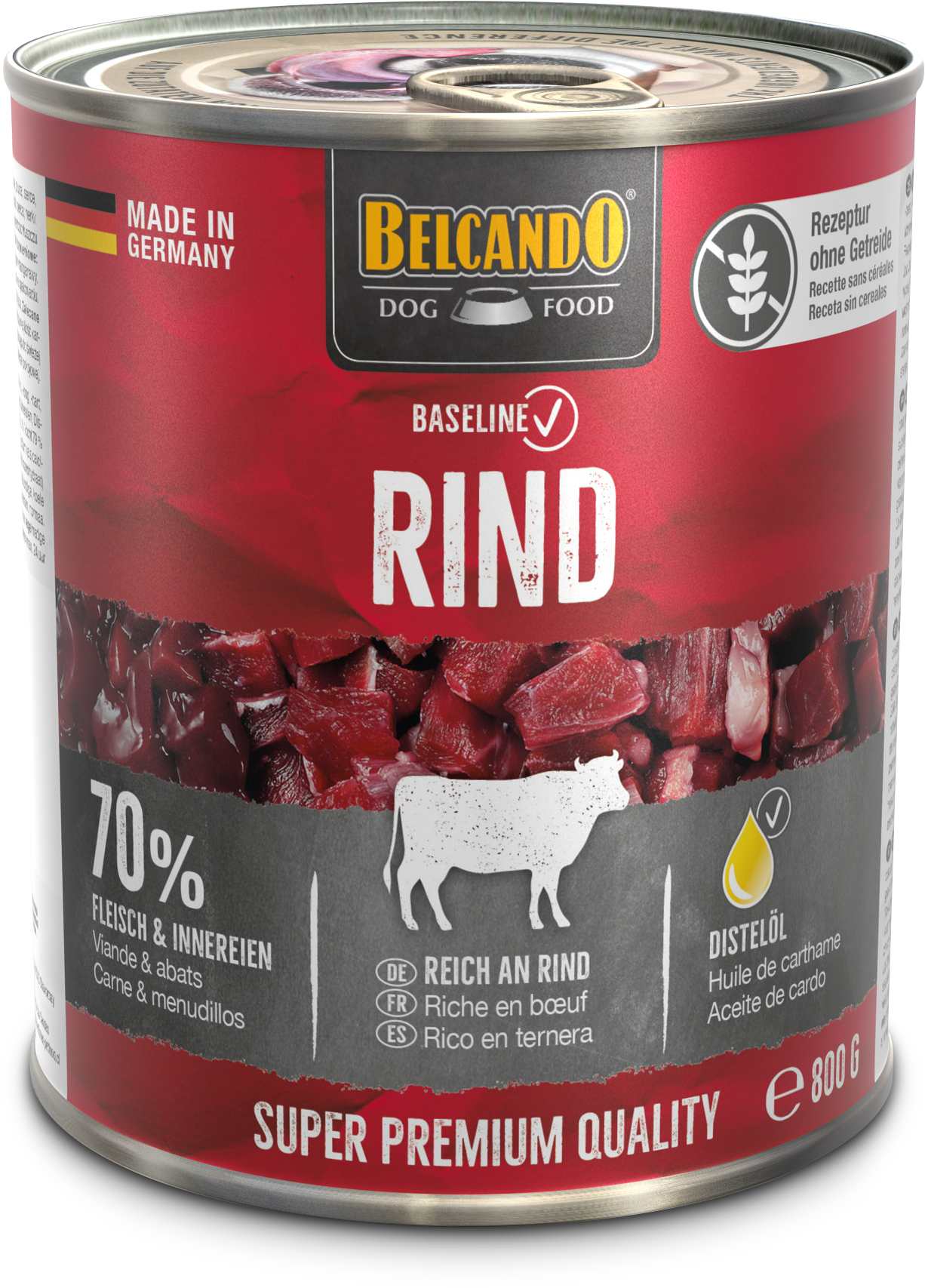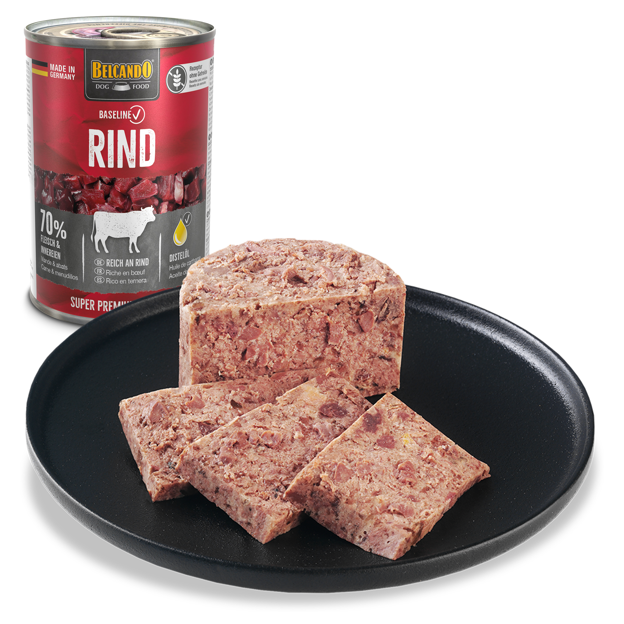 Rezeptur ohne Getreide, reich an Rind, 70 % Fleisch und Innereien.