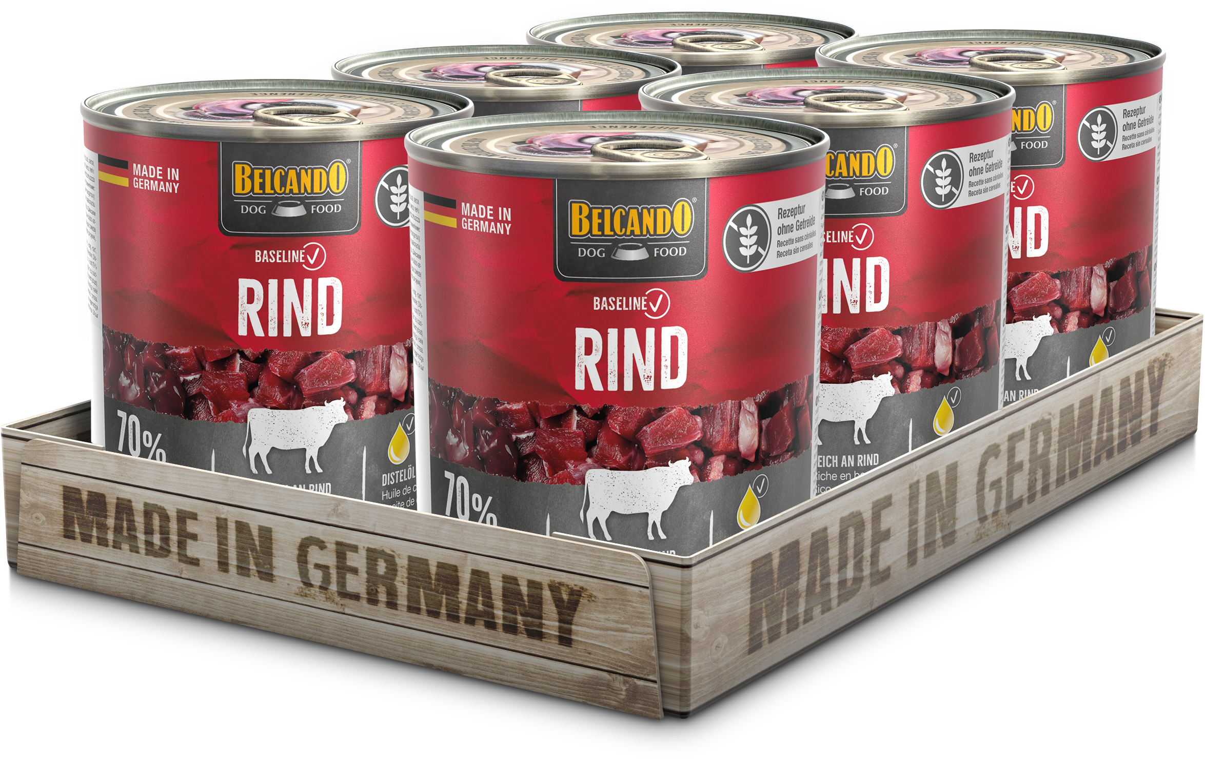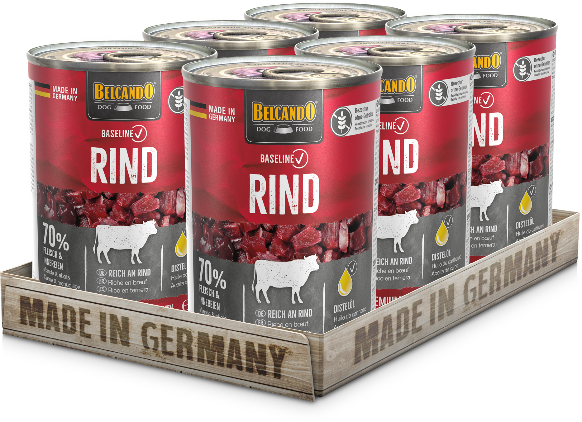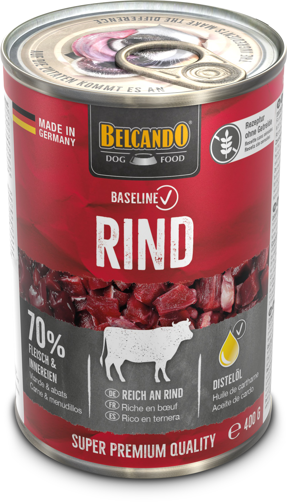 Rezeptur ohne Getreide, reich an Rind, 70 % Fleisch und Innereien.