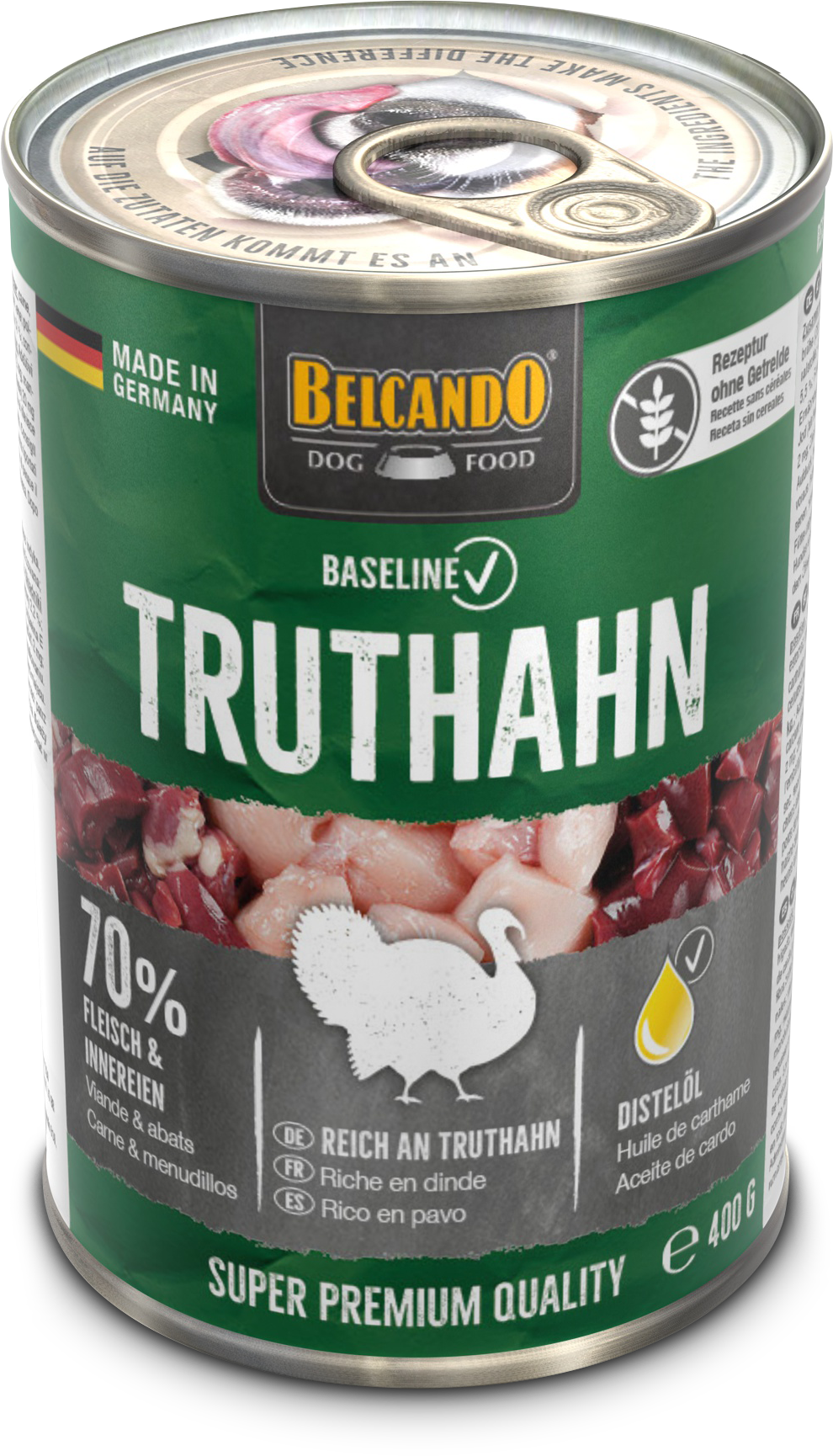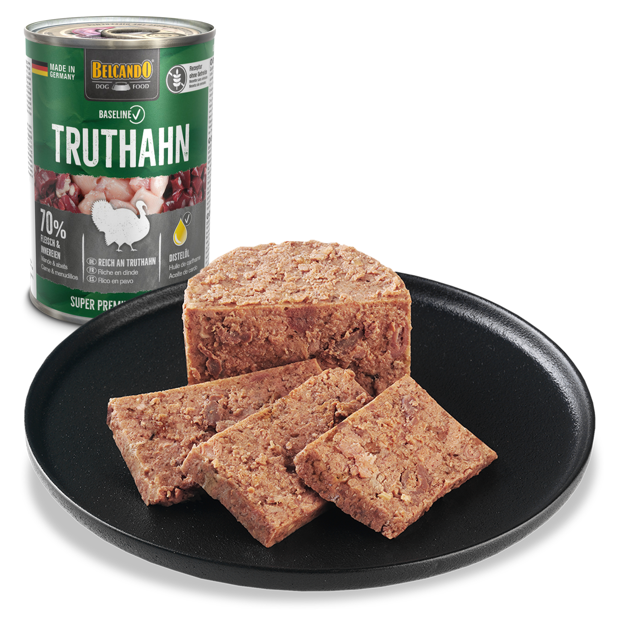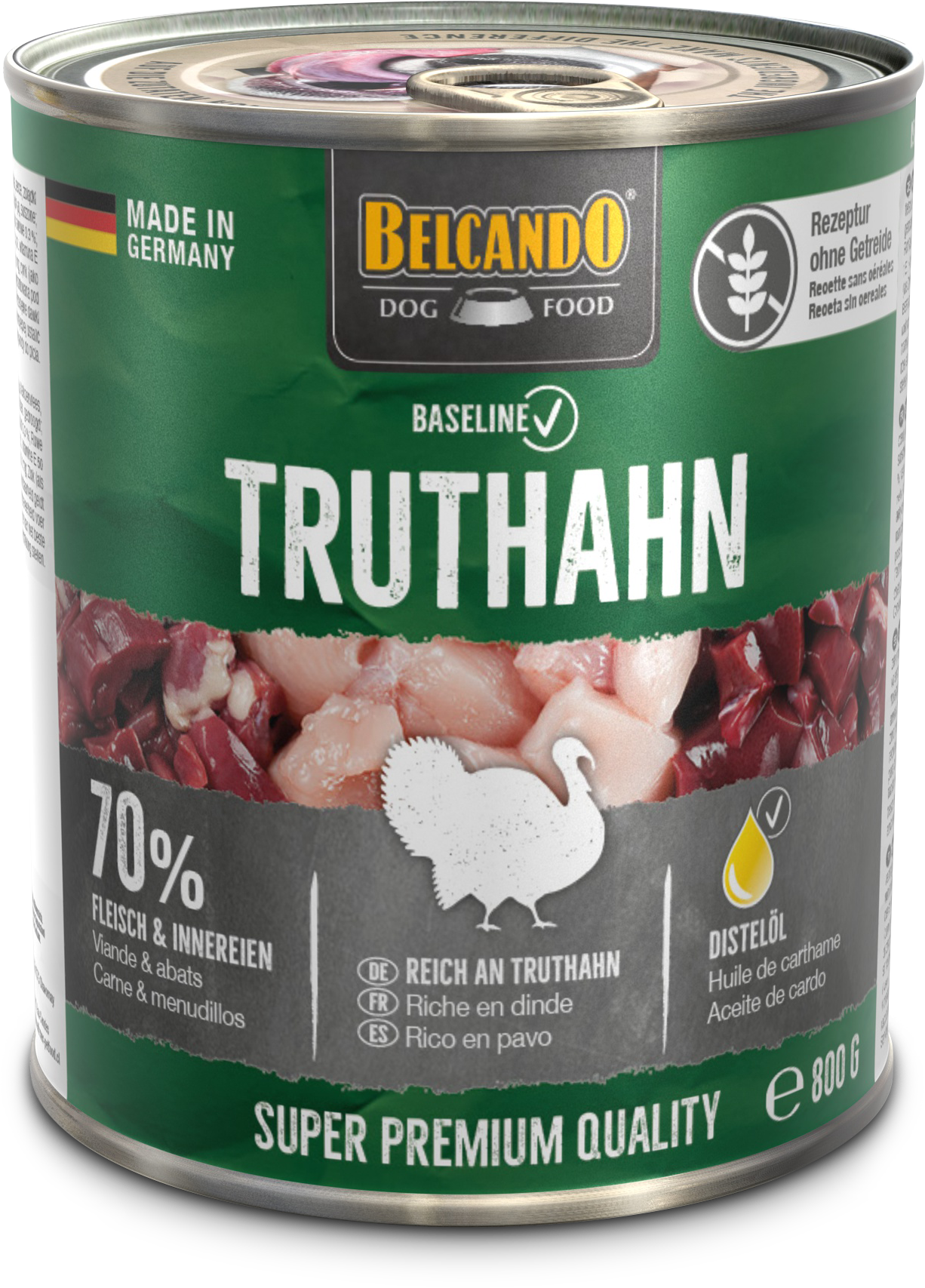 Rezeptur ohne Getreide, reich an Truthahn, 70 % Fleisch und Innereien.