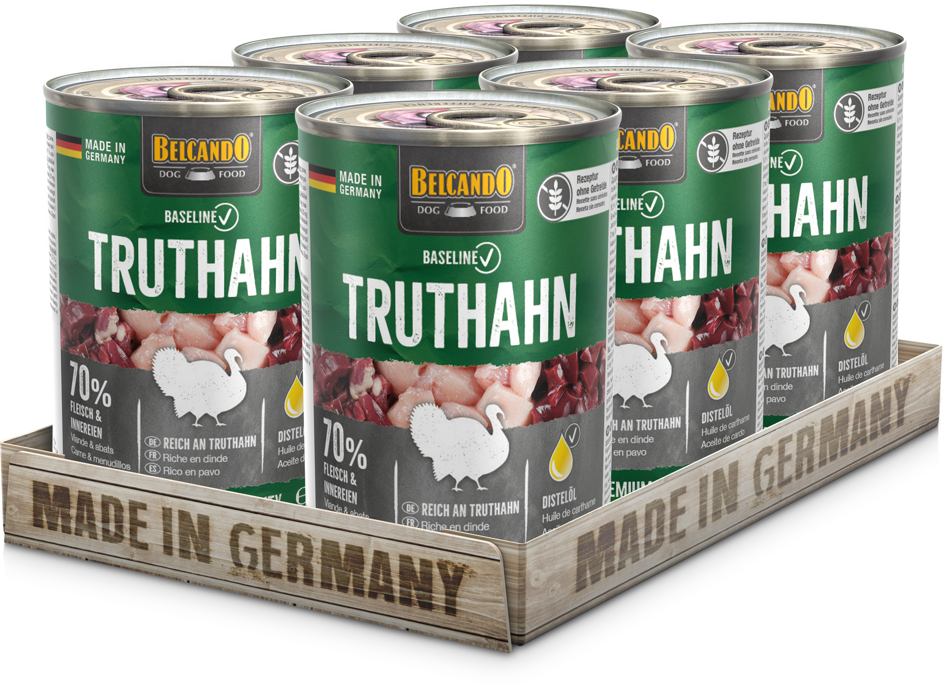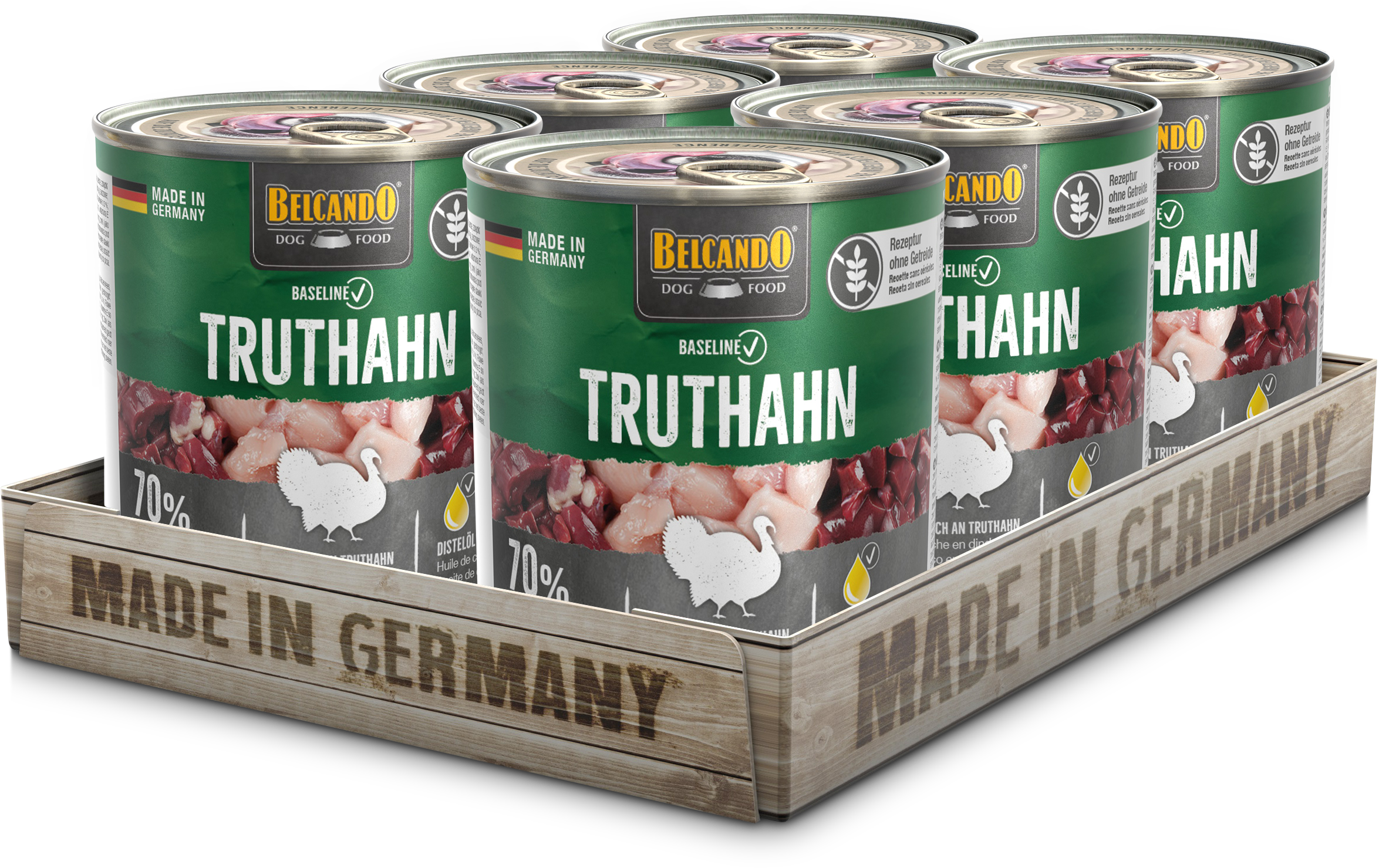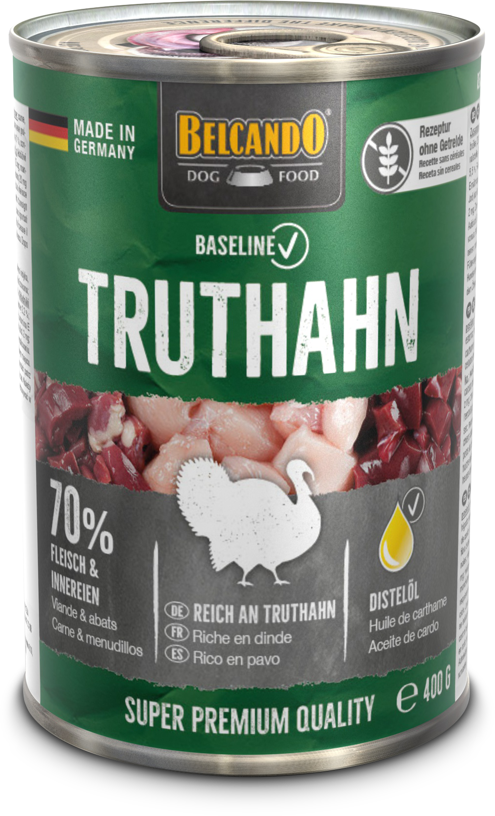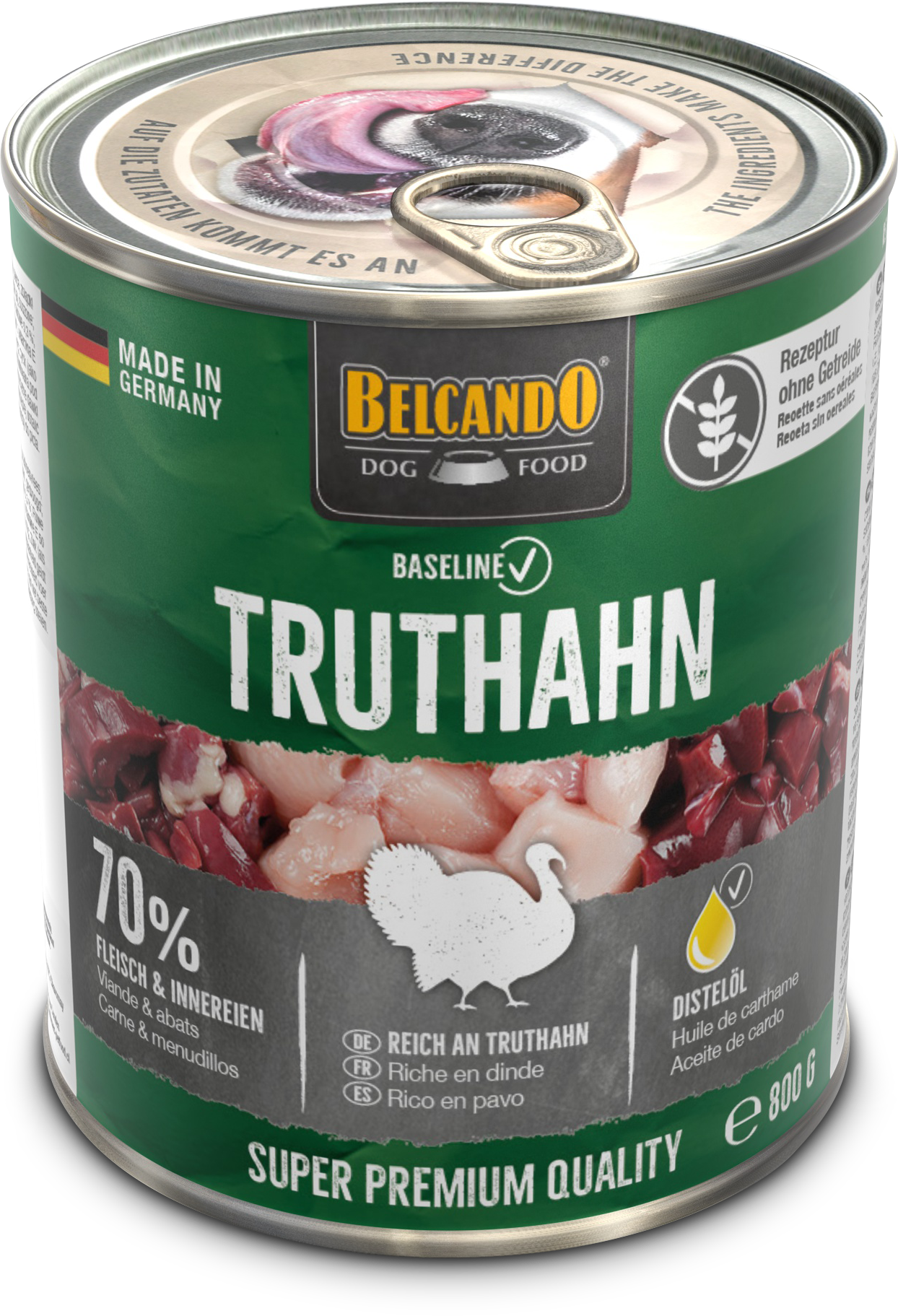 Rezeptur ohne Getreide, reich an Truthahn, 70 % Fleisch und Innereien.
