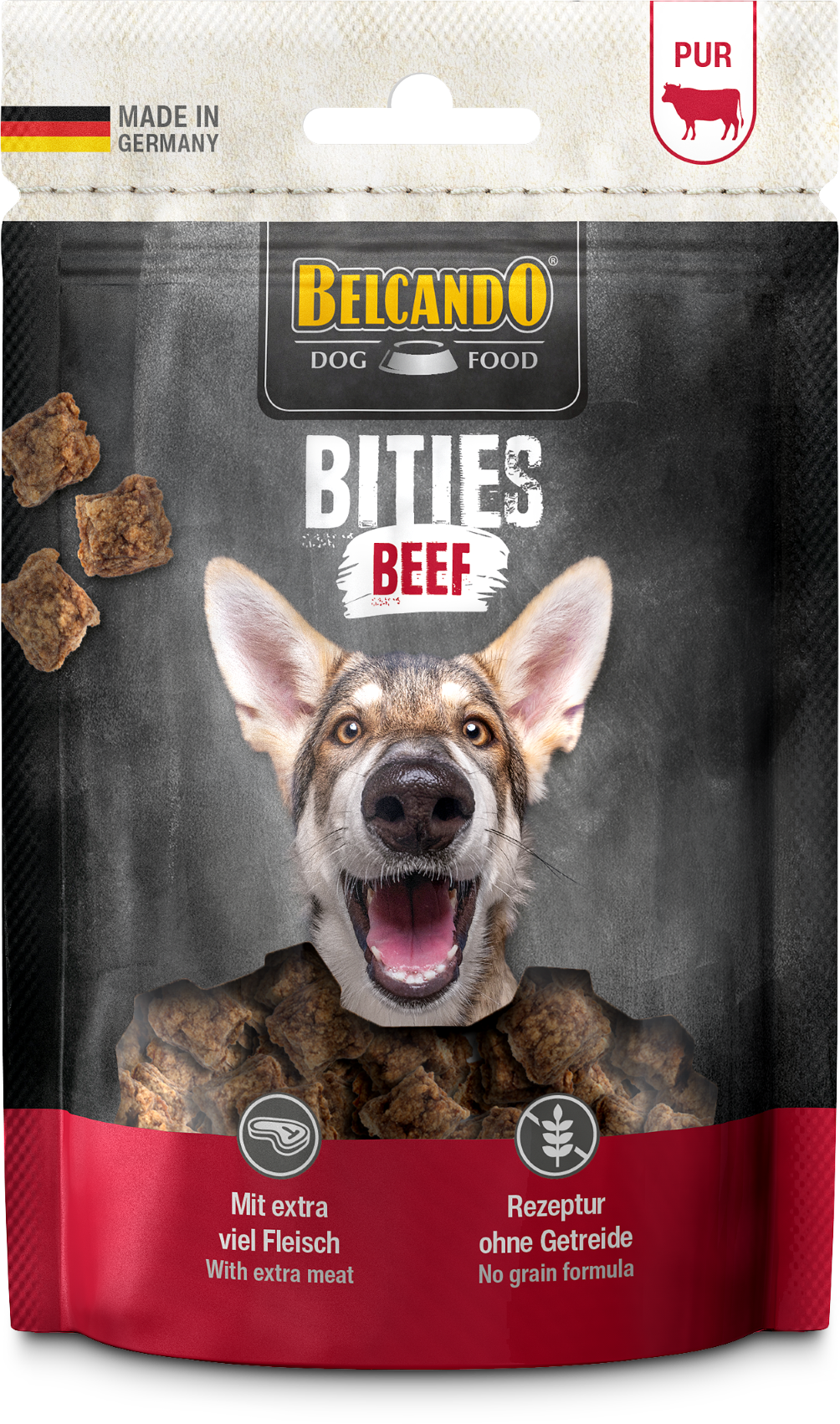 Happs und weg! Bities Beef sind so lecker, dass sie ratzfatz weggesnackt sind. Unwiderstehlich leckeres Rindfleisch bedeutet nicht nur extra viel Geschmack, sondern auch große Freude in feinen Häppchen. Die Bities sind natürlich „Made in Germany“ mit extra viel Fleisch. Die Rezeptur ohne Getreide oder Zucker wird schonend luftgetrocknet und verwendet als Besonderheit nur eine tierische Proteinquelle (monoprotein). Diese getreidefreien Hundesnacks sind das ideale Hundeleckerlie für sensible Hunde oder solche mit Allergien. Perfekt als Trainingssnack oder als Belohnung zwischendurch!
