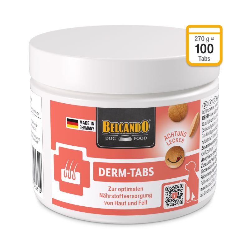 DERM-Tabs liefern Nährstoffe, die dafür bekannt sind, Haut und Fell in ihrer Beschaffenheit positiv zu unterstützen. Biotin in hohen Konzentrationen fördert die Qualität von Haut, Haar und Krallen. Bei empfindlichen, spröden Pfoten wird dieses Vitamin ebenfalls empfohlen. Omega-3-Fettsäuren (DHA) aus Trockenalgen (Schizochytrium sp.) unterstützen die physiologische Hautfunktion und glänzendes Fell. Aminosäure-Zinkchelat ist eine organische Zink-Quelle mit optimaler Bio-Verfügbarkeit. Eine bedarfsgerechte Zinkversorgung fördert die Pigmentierung und unterstützt bei Haut und Fell. Bierhefe ist besonders reich an wichtigen natürlichen Nährstoffen.