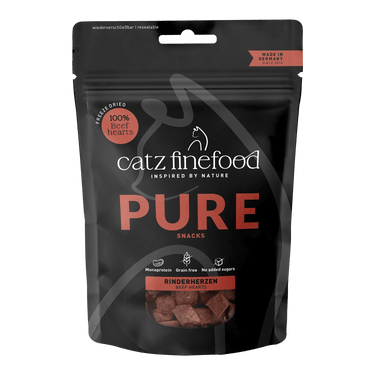 catz finefood® PURE SNACKS sind genau das Richtige für Katzen, die puren Geschmack lieben – und keine unnötigen Zusätze. Die Sorte Rinderherzen besteht zu 100 % aus hochwertigem Fleisch und wird schonend gefriertrocknet, damit Nährstoffe und Aroma optimal erhalten bleiben.