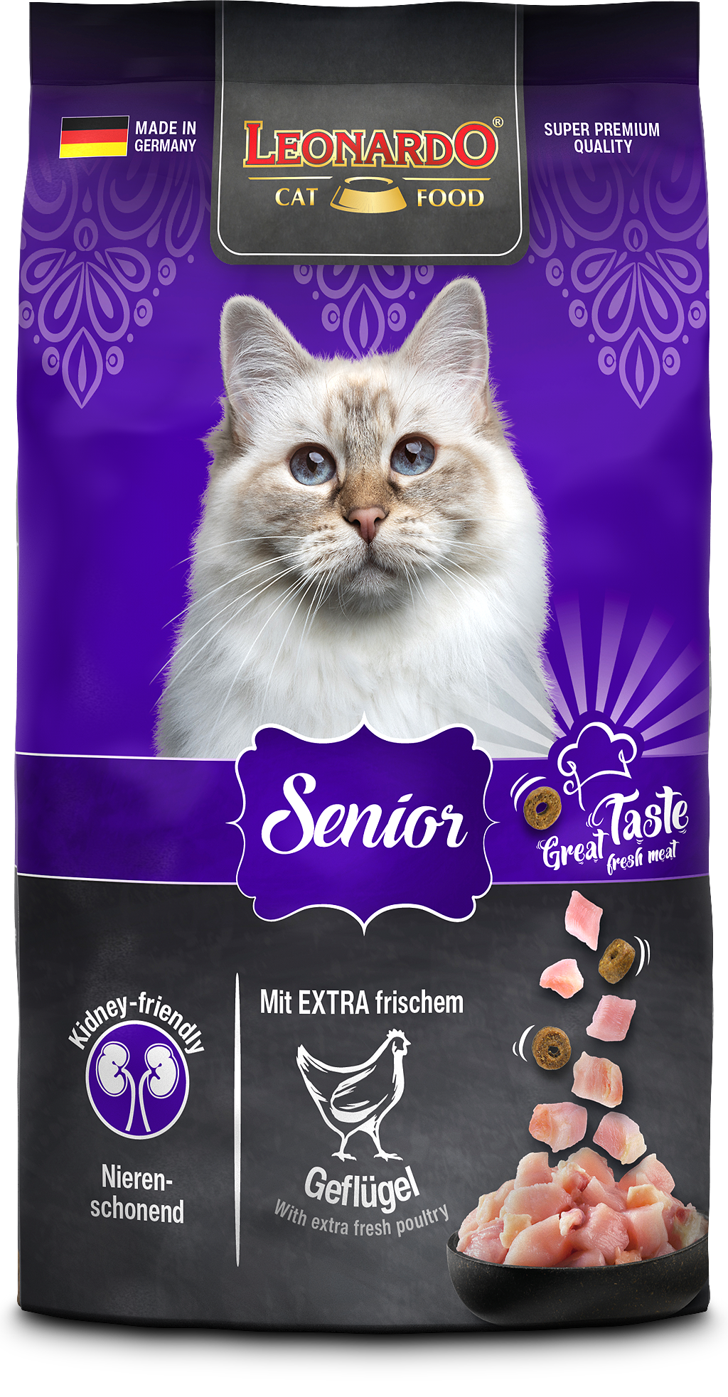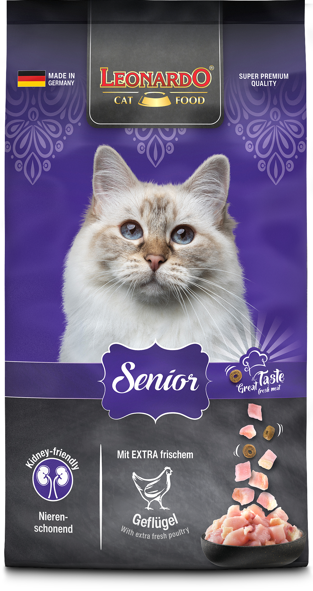 Wenn Ihre Katze langsam in die Jahre kommt, verändern sich auch die Nährstoffansprüche. Der Energiebedarf sinkt und das Immunsystem wird im Alter schwächer. LEONARDO® Senior passt sich mit einer speziellen Rezeptur diesen Veränderungen an und hält Ihre Katze bis ins hohe Alter fit und gesund. Das Katzenfutter ist nierenschonend durch weniger Phosphor, Natrium und Protein.