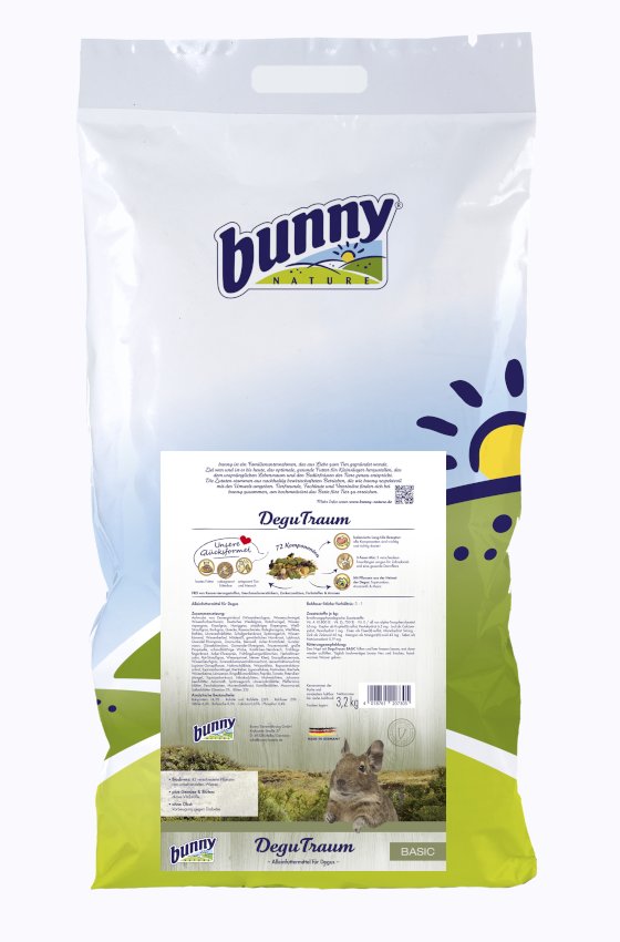 DeguTraum BASIC ist vollkommen ausgewogen. Es kann zur freien Verfügung (ad lib) gefüttert werden. Das bedeutet: Napf auffüllen, leerfressen lassen und erst dann erneut auffüllen. Die Tiere werden lediglich ihren notwendigen Bedarf decken. Dazu täglich frisches, handwarmes Wasser und hochwertiges bunny Heu. Somit ist die optimale Versorgung 24/7 gewährleistet – ohne Dosierung, Rationierung oder Verknappung.