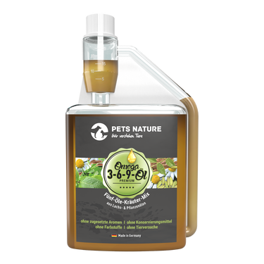Während unser Lachsöl reichlich Omega-3-Fettsäuren liefert, enthält unser Distelöl hauptsächlich die Omega-6-Fettsäure Linolsäure. Das Hanföl, welches selbstverständlich THC-frei ist, ergänzt das Futter mit Omega-3- und Omega-6-Fettsäuren. Mit unserem Omega 3-6-9-Öl werden gleich drei Fettsäuren abgedeckt und es enthält zudem wohltuende Kräuter wie Kamille, Fenchel und Bockshornklee.