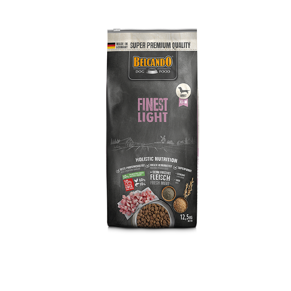 Lecker, sättigend und gesund dank ausgewählter Rohstoffe. Schmackhafte Ente und Leber machen Appetit. Kerniger Hafer fördert das Sättigungsgefühl und ist reich an essentiellen Fettsäuren ebenso wie die Chiasaat, die eine gesunde Verdauung fördert. Der begrenzte Gehalt an Protein und Fett macht BELCANDO® Finest Light zu einem besonders geeigneten Futter für Hunde mit geringer Aktivität und ältere Hunde. Ein besonders hoher Anteil an Rohfasern erleichtert das Halten oder Verringern des Körpergewichtes bei angemessener Sättigung. Die Reduktion von Phosphor und Natrium entlastet die Nieren. Anteil tierisches Eiweiß am Gesamteiweiß: 70 % (aus Geflügel 60 %, aus Fisch 10 %) Als Besonderheit zur Förderung des Geschmacks wurde BELCANDO® Finest Light mit einer speziellen Sauce ausgestattet. Unter sorgfältigem Anrühren von 3 Teilen BELCANDO® Finest Light mit 1 Teil warmen Wasser (40-50 °C) bildet sich ein besonders schmackhafter Soßenüberzug über die Futterpartikel. Dieser ist für wählerische Hunde eine besondere Delikatesse. Aber auch bei trockener Fütterung zeichnet sich BELCANDO® Finest Light durch höchsten Geschmack aus.