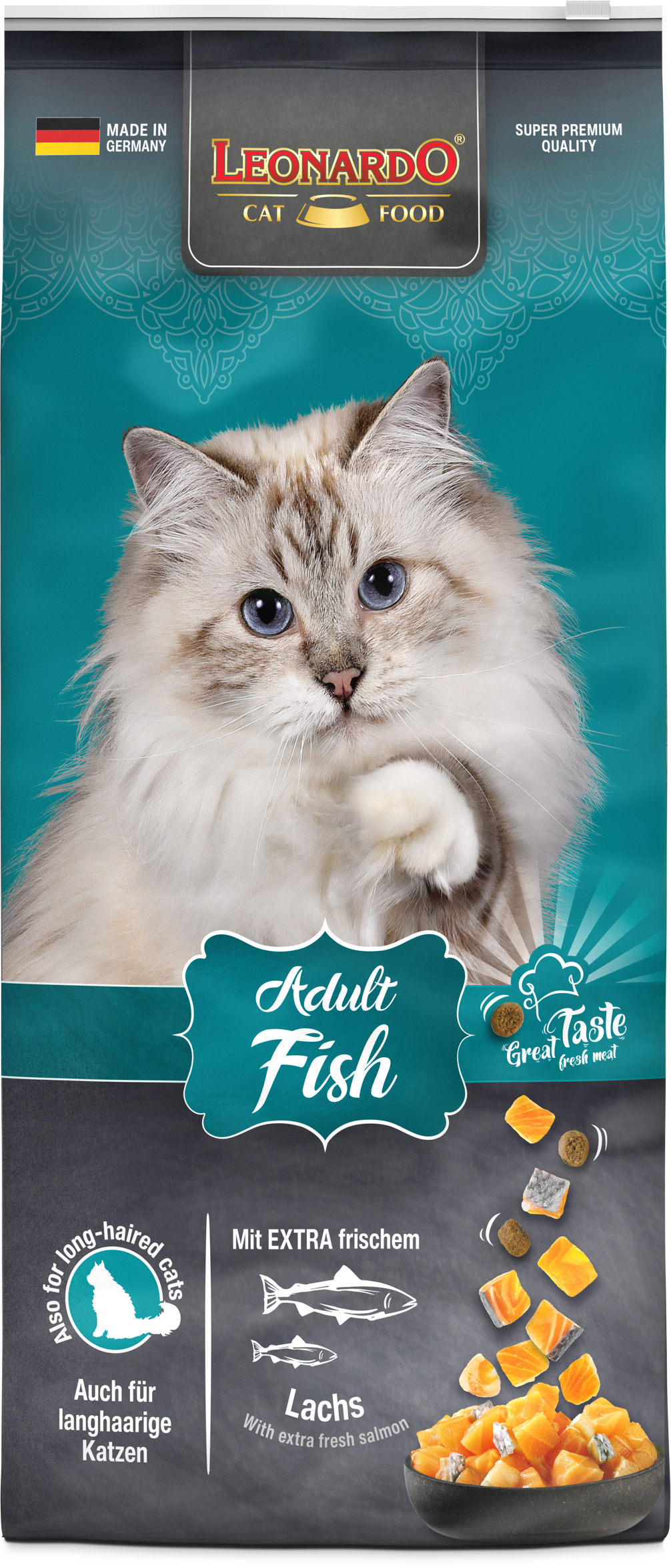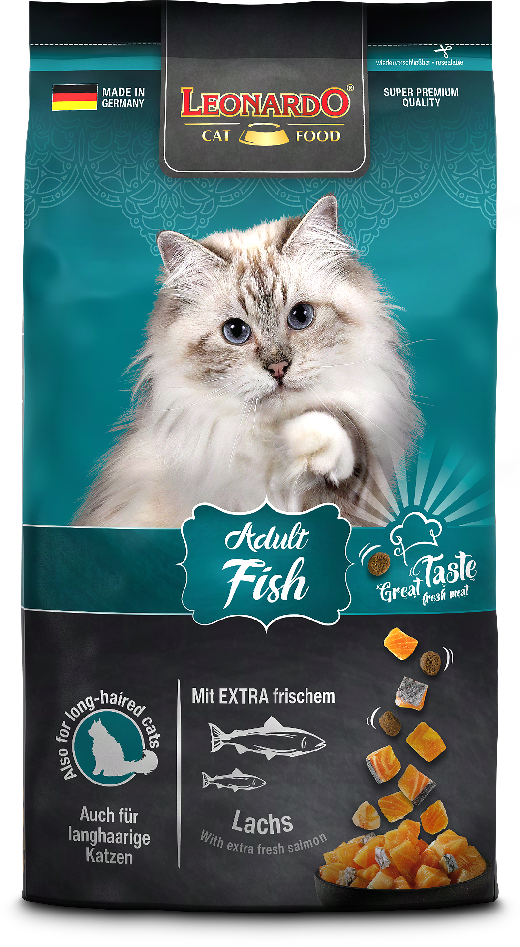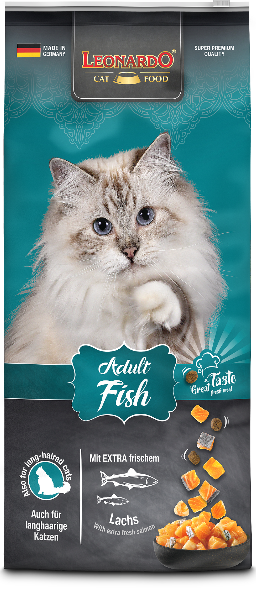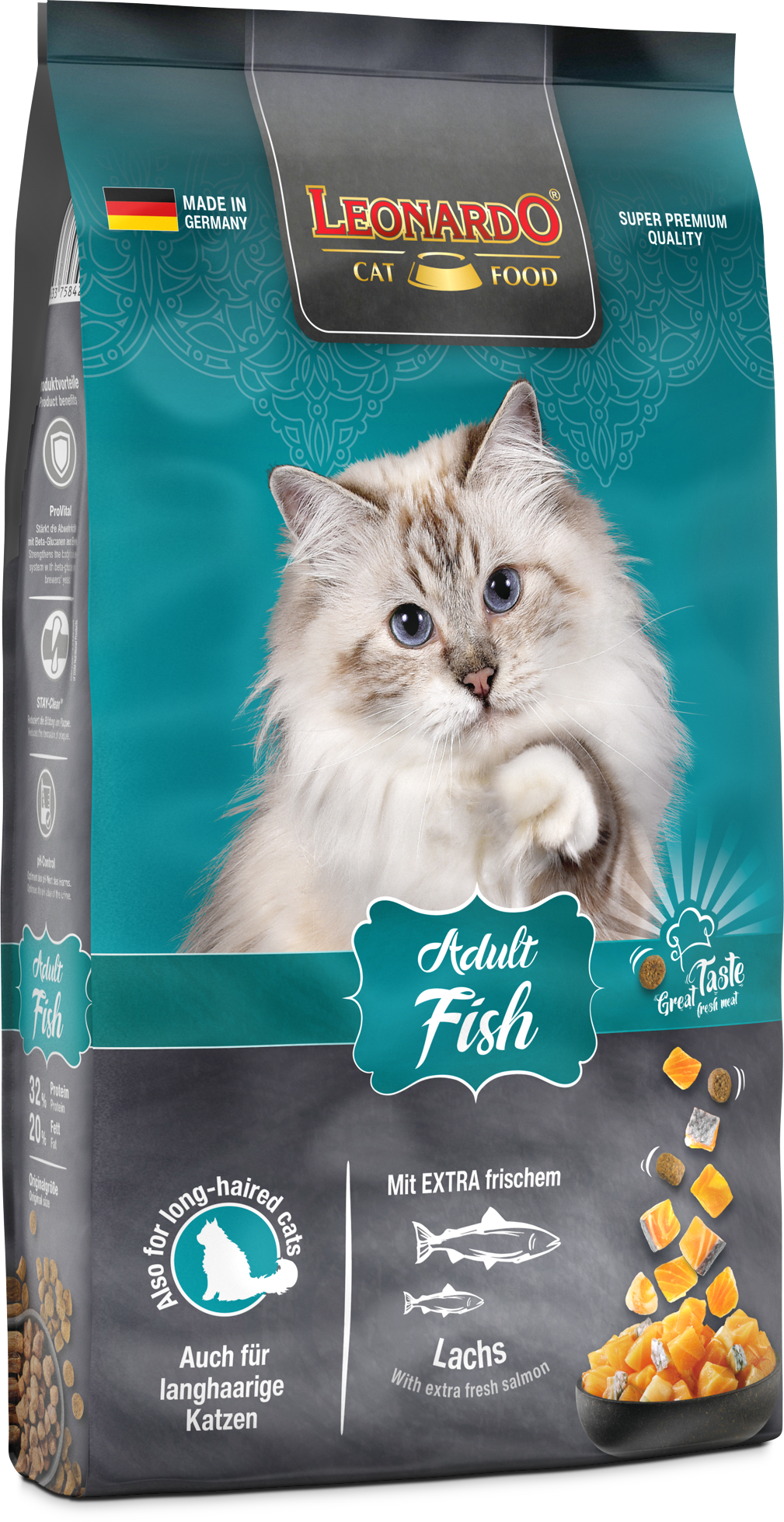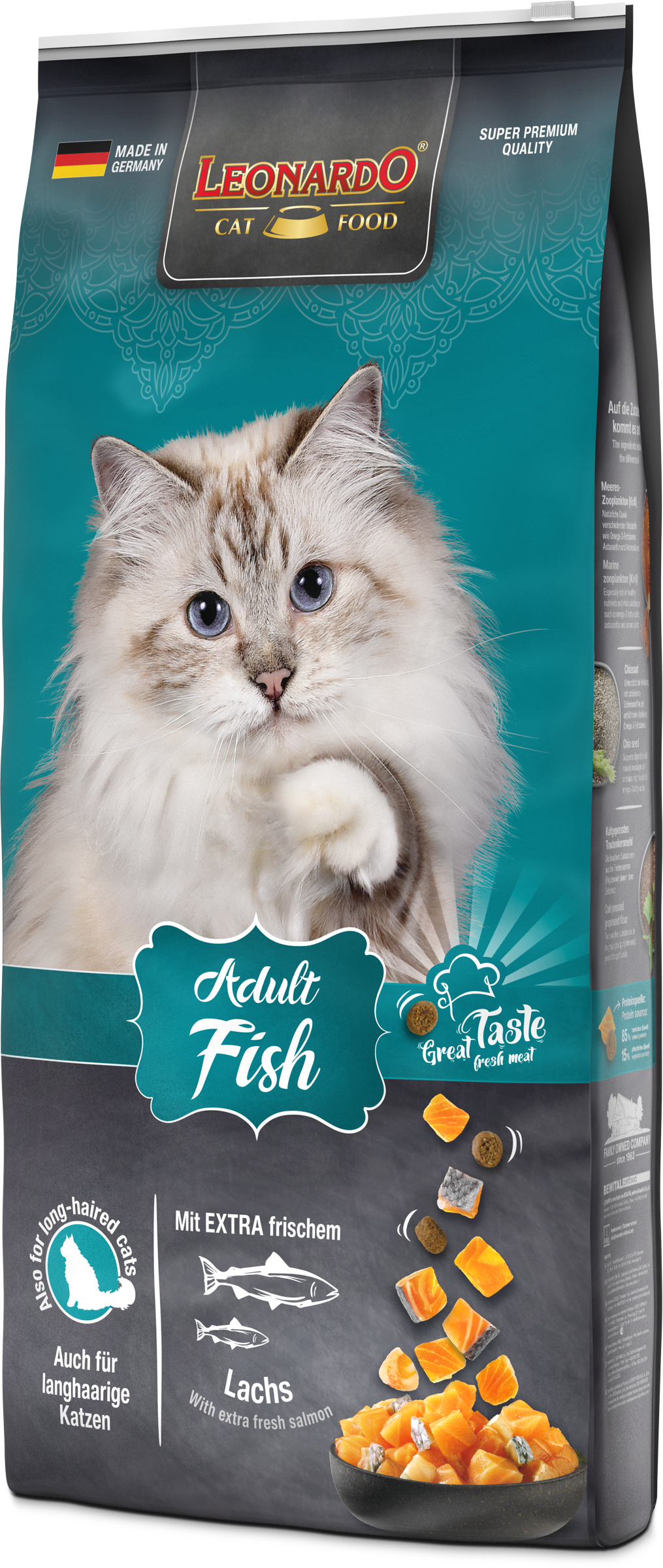 LEONARDO® Adult Fish ist die gesunde Vielfalt aus dem Meer. Verfeinert mit vitalisierendem Krill - den Krustentieren aus der Antarktis - sind die leckeren Kroketten ein Highlight für Fischfans aus dem LEONARDO® Adult Programm. Die natürlichen Omega-3-Fettsäuren aus dem Meeresfisch sorgen für ein seidiges Fell und eine gesunde Haut. Das Katzenfutter ist auch für langhaarige Katzen geeignet.