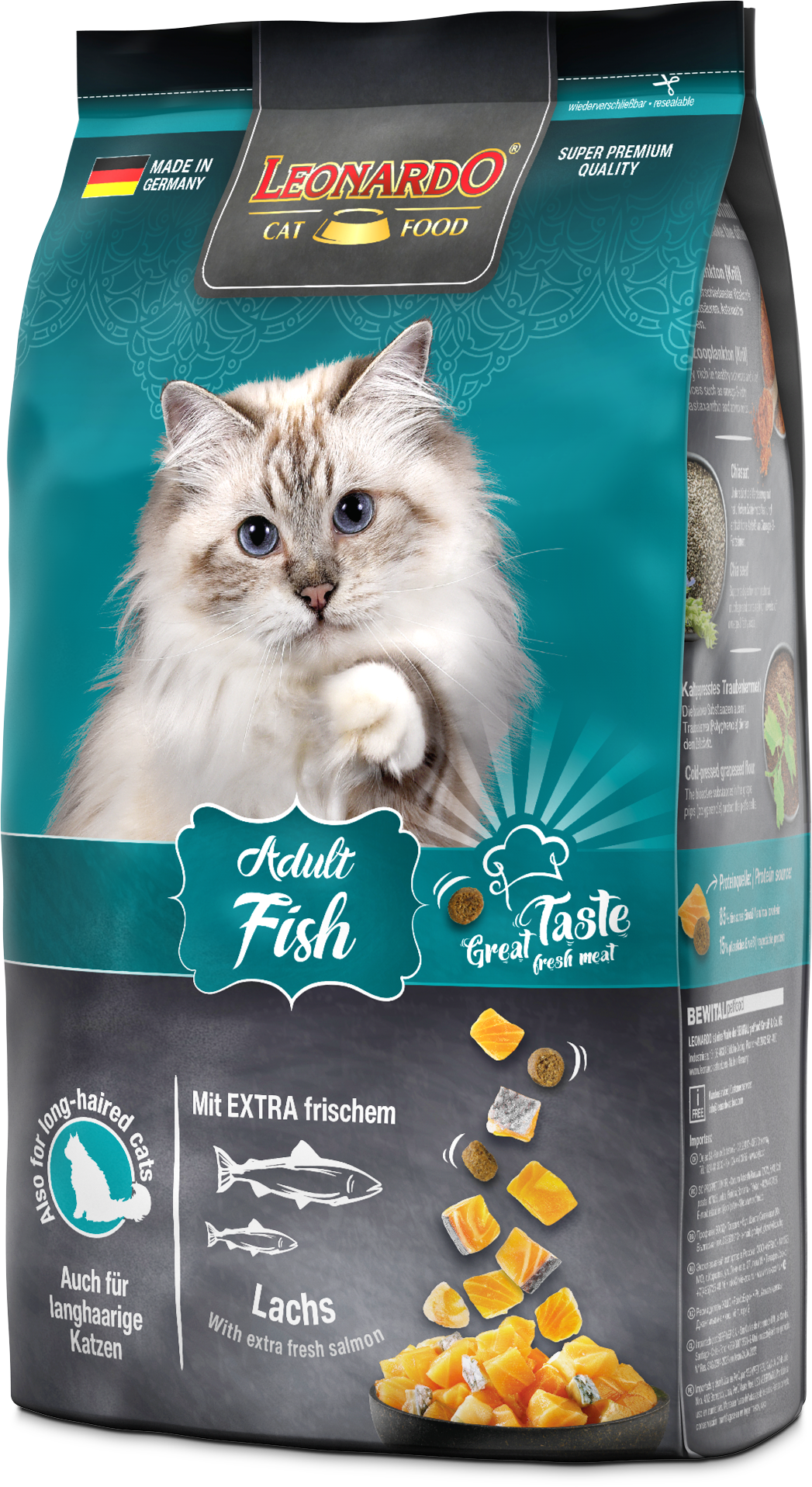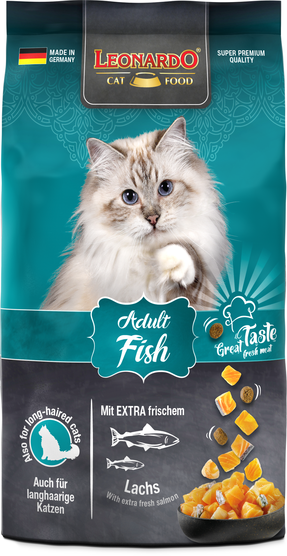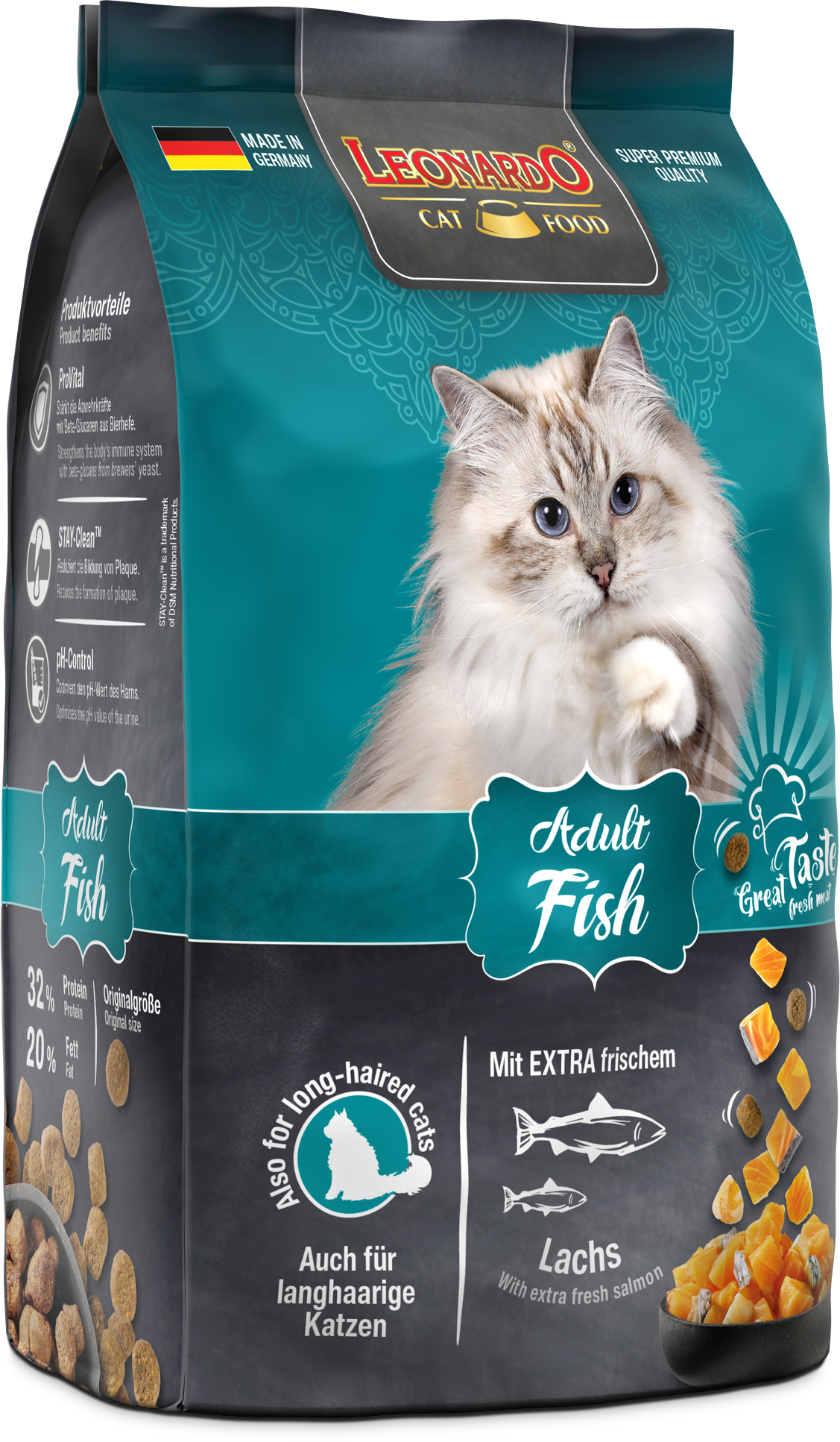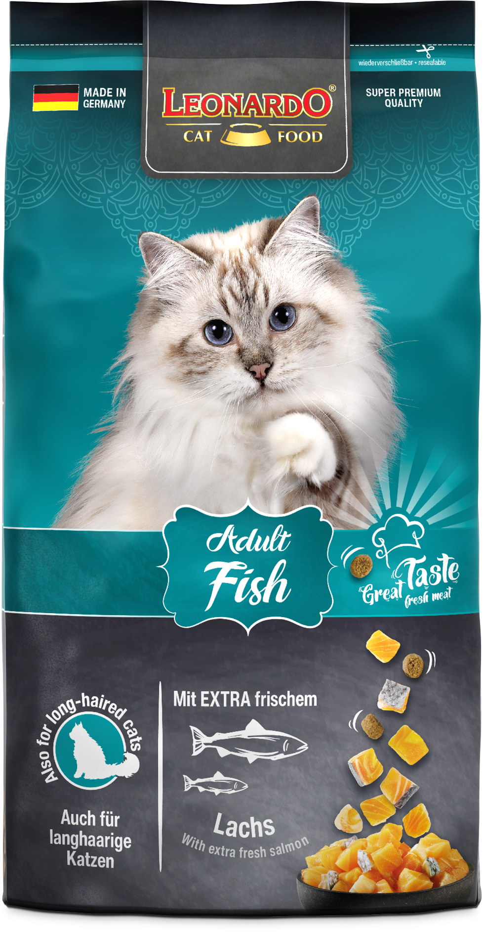 LEONARDO® Adult Fish ist die gesunde Vielfalt aus dem Meer. Verfeinert mit vitalisierendem Krill - den Krustentieren aus der Antarktis - sind die leckeren Kroketten ein Highlight für Fischfans aus dem LEONARDO® Adult Programm. Die natürlichen Omega-3-Fettsäuren aus dem Meeresfisch sorgen für ein seidiges Fell und eine gesunde Haut. Das Katzenfutter ist auch für langhaarige Katzen geeignet.
