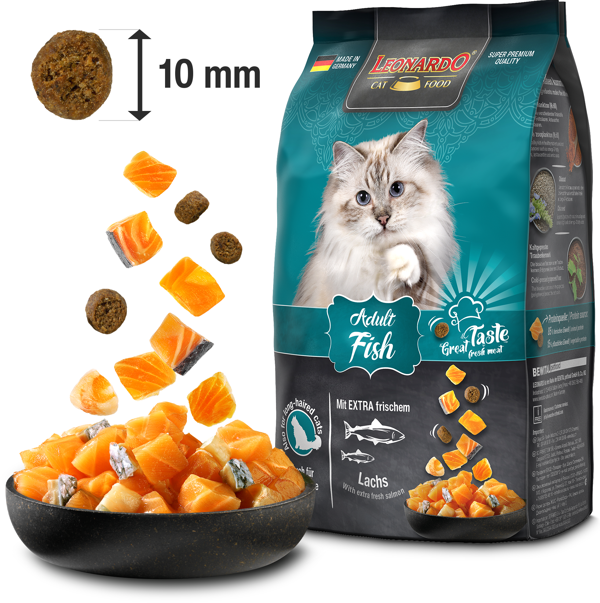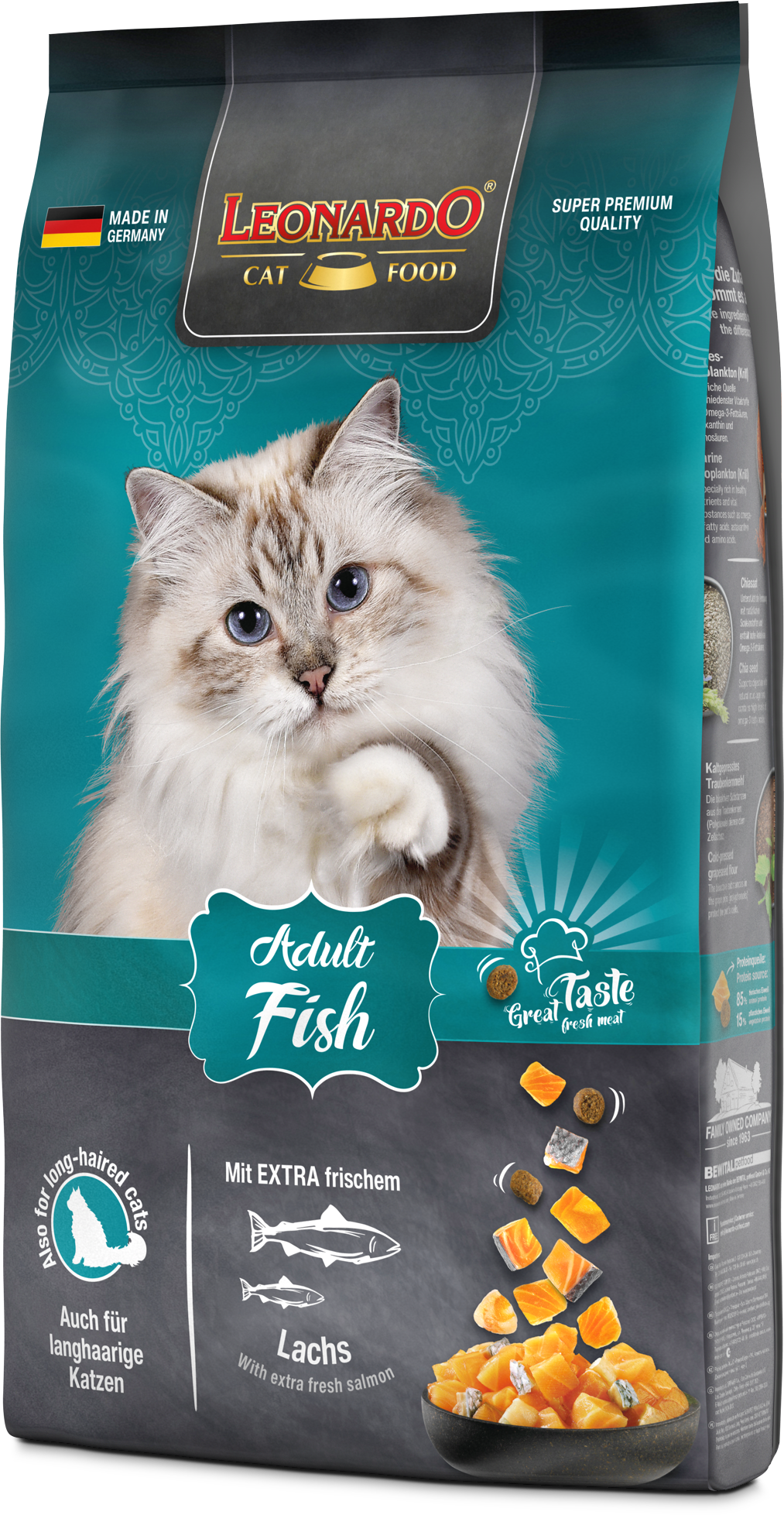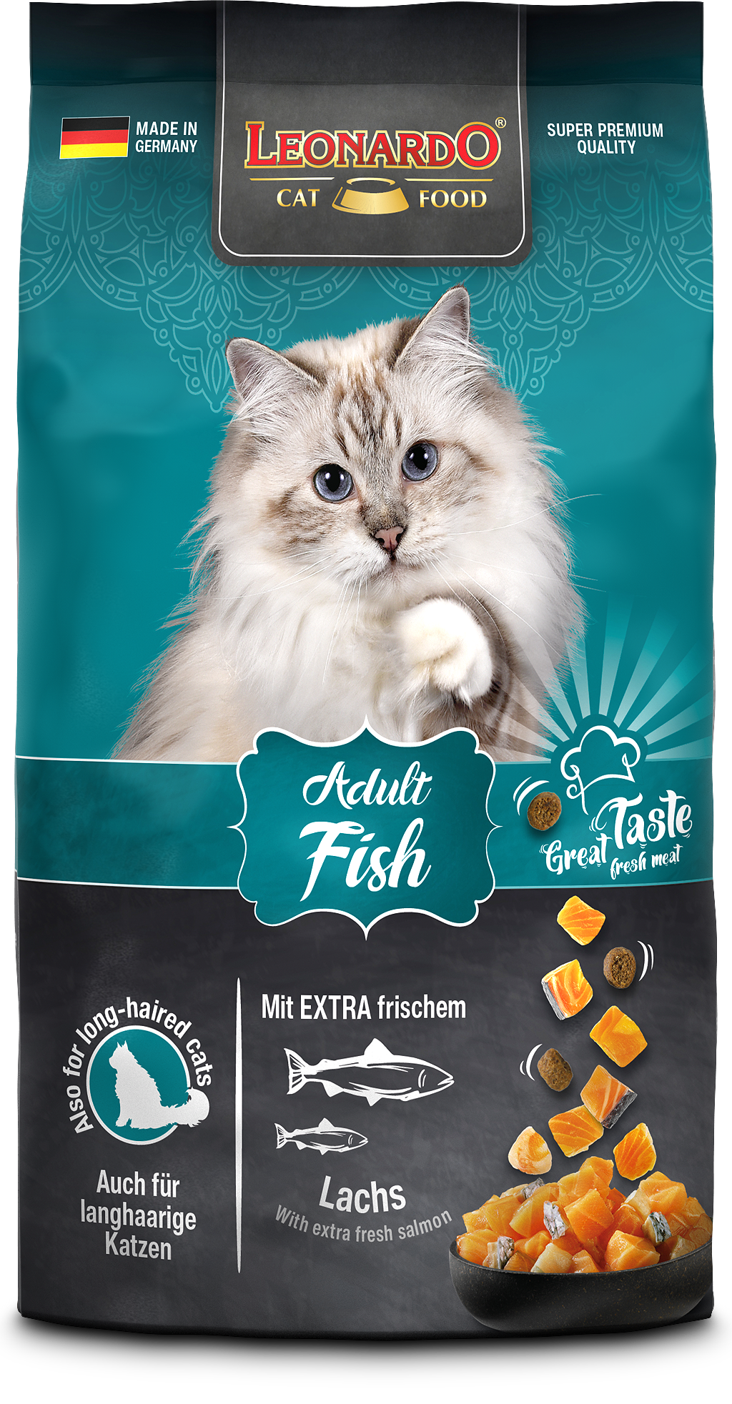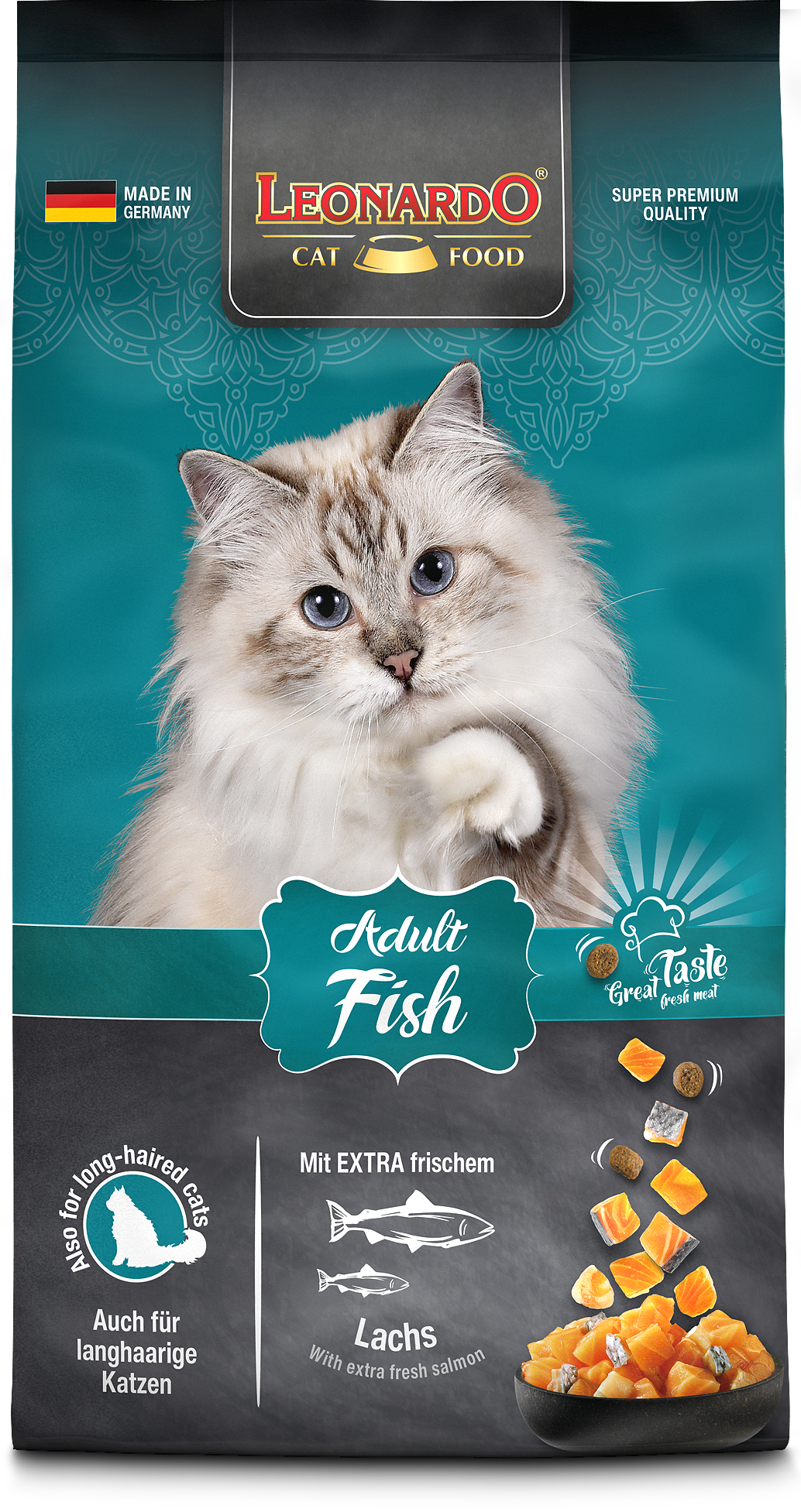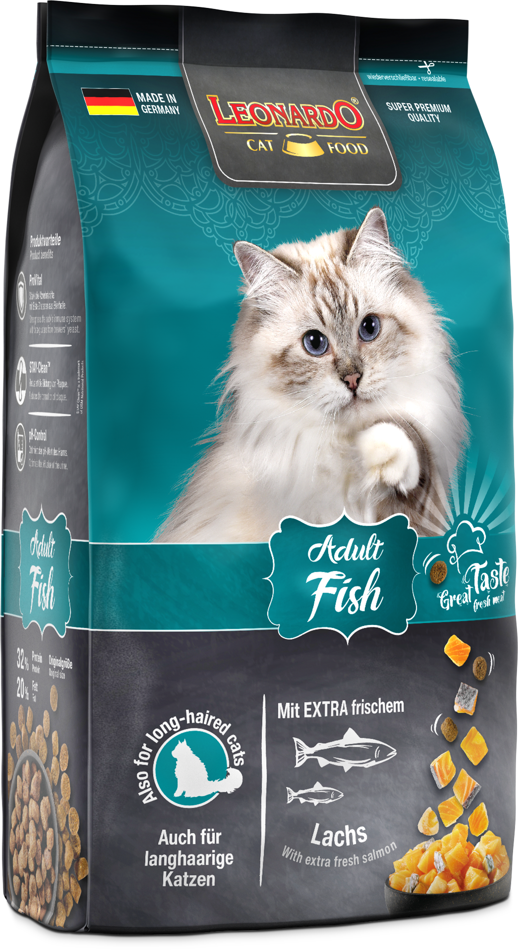 LEONARDO® Adult Fish ist die gesunde Vielfalt aus dem Meer. Verfeinert mit vitalisierendem Krill - den Krustentieren aus der Antarktis - sind die leckeren Kroketten ein Highlight für Fischfans aus dem LEONARDO® Adult Programm. Die natürlichen Omega-3-Fettsäuren aus dem Meeresfisch sorgen für ein seidiges Fell und eine gesunde Haut. Das Katzenfutter ist auch für langhaarige Katzen geeignet.