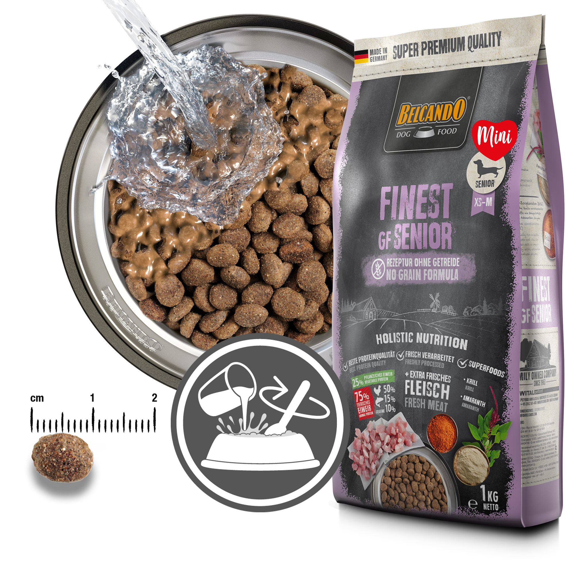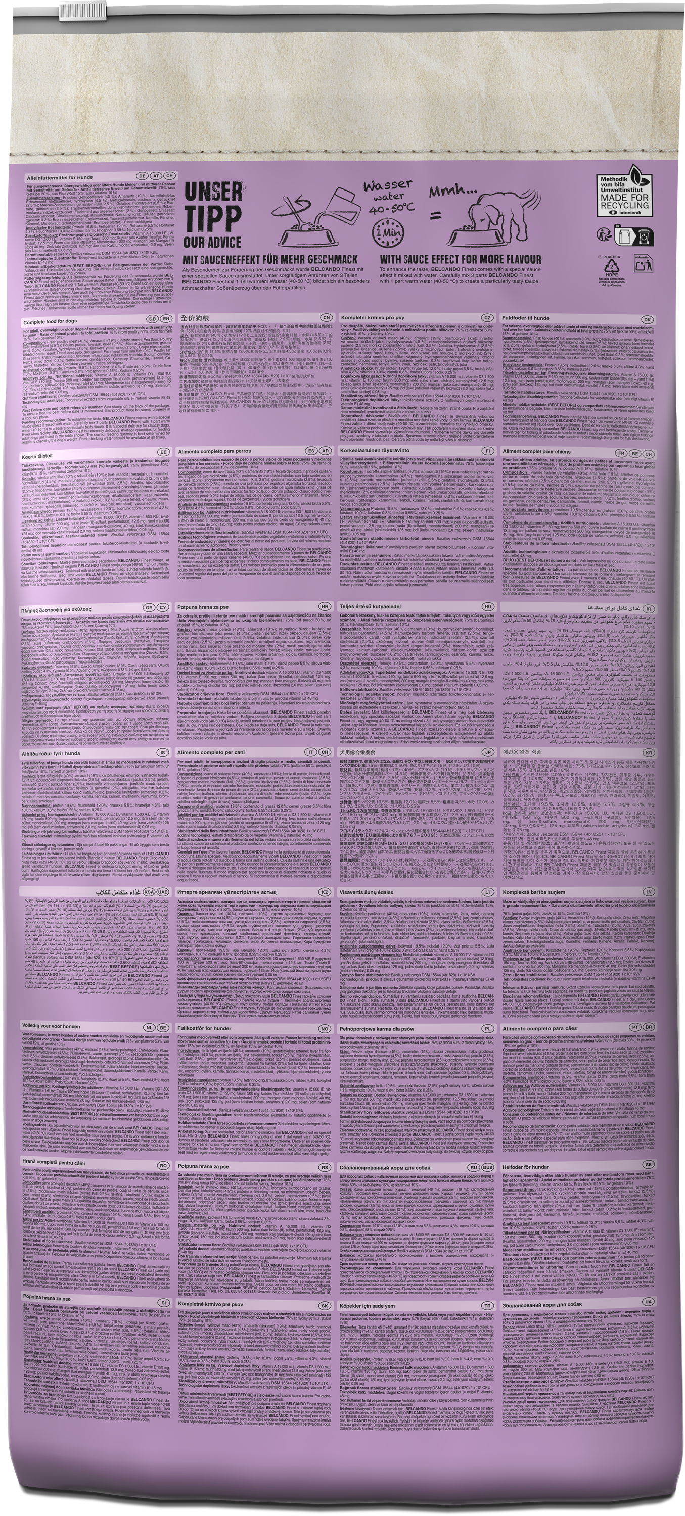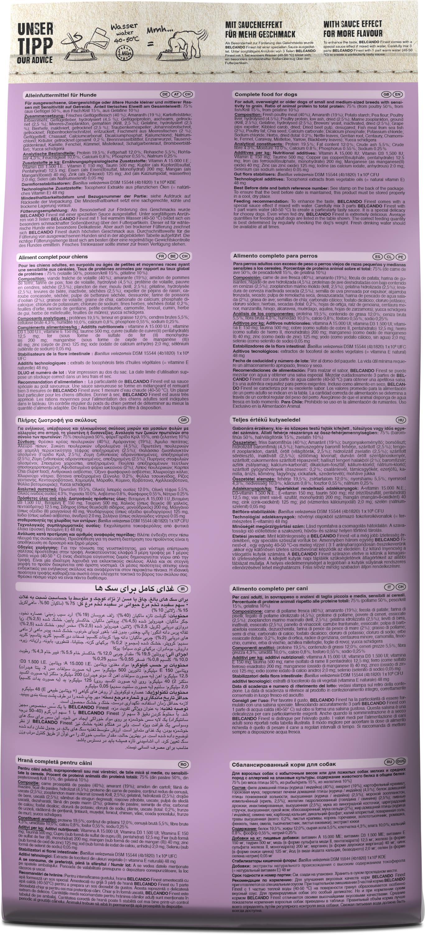 Als Besonderheit zur Förderung des Geschmacks wurde BELCANDO® Finest mit einer speziellen Sauce ausgestattet. Unter sorgfältigem Anrühren von 3 Teilen BELCANDO® Finest mit 1 Teil warmem Wasser (40-50 °C) bildet sich ein besonders schmackhafter Soßenüberzug über die Futterpartikel. Dieser ist für wählerische Hunde eine besondere Delikatesse. Aber auch bei trockener Fütterung zeichnet sich BELCANDO® Finest durch höchsten Geschmack aus.