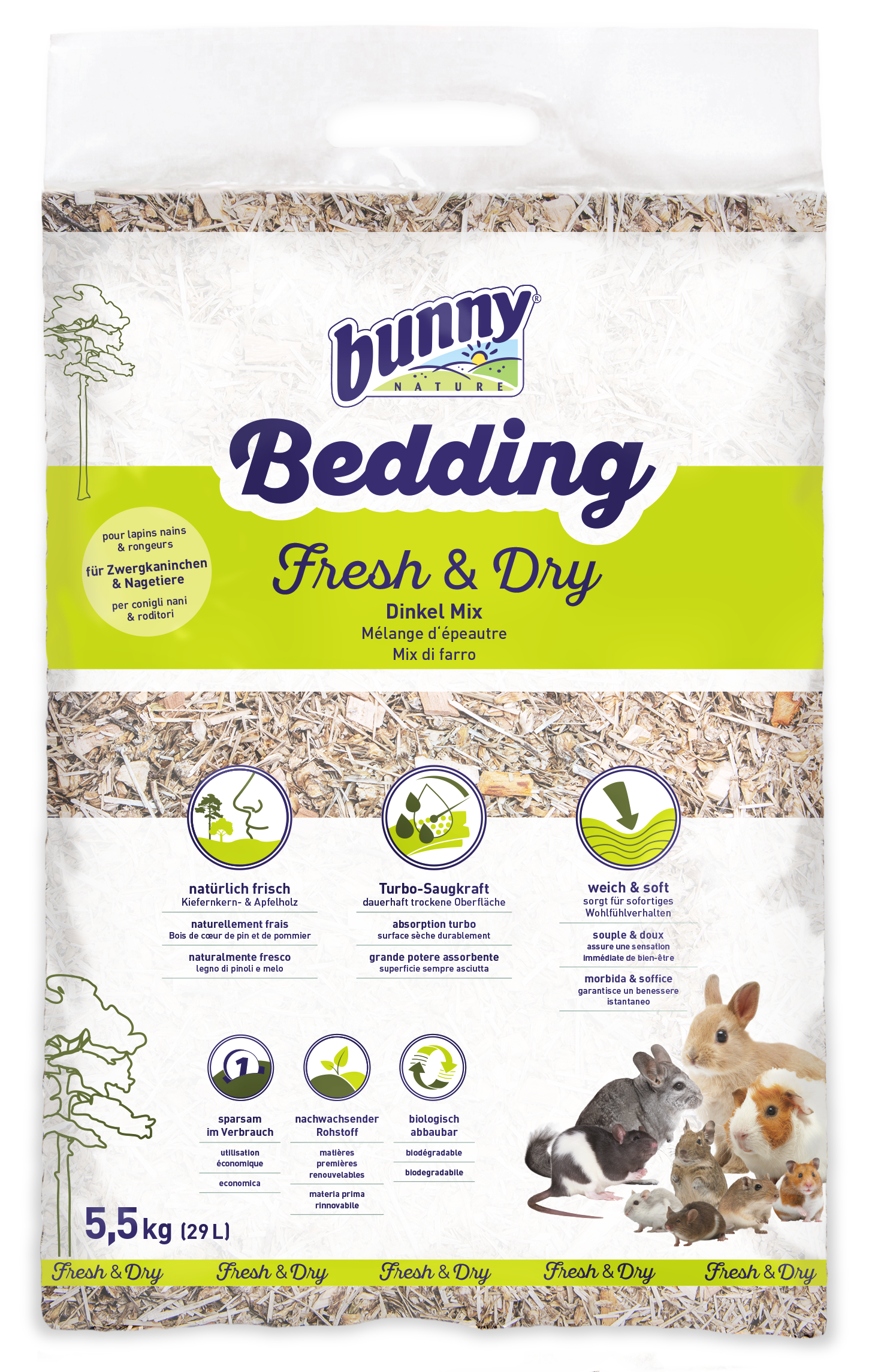 Der einzigartige Einstreu-Mix von bunnyBedding Fresh & Dry aus den Naturprodukten Dinkel, Leinen, Kiefernkern- und Apfelholz, bietet eine lang anhaltene Frische und trockene Oberfläche über Wochen. Sie ist für alle Pfoten erfreulich weich, was zu sofortigem Wohlfühlverhalten führt.