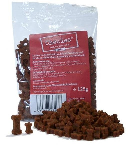 Chewies Lachsknöchelchen sind schmackhafte Trainingsleckerli und bei Hunden und Katzen sehr beliebt! Aufgrund ihrer hohen Akzeptanz und ihrer handlichen Größe sind Chewies auch für unterwegs ein ideales Leckerli. Hunde und Katzen sind mit diesem leckeren Snack gut zu motivieren. Chewies MINI eignen sich besonders für Hunde kleiner Rassen (small and toy dogs) und Katzen. Doch auch größere Hunde können die noch kleineren MINI-Knöchelchen leichter schlucken. Chewies sind Belohnung pur für Ihren Liebling!