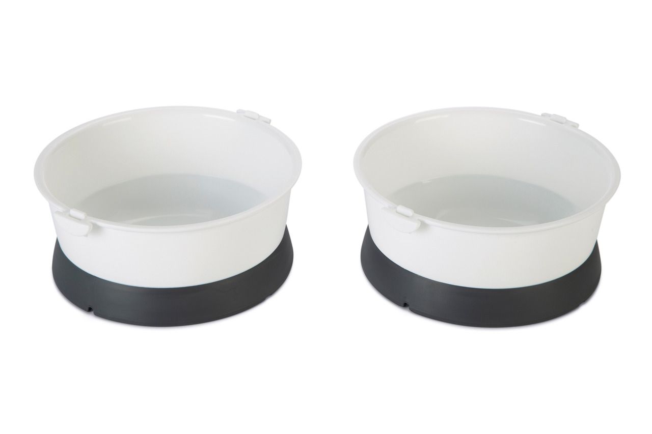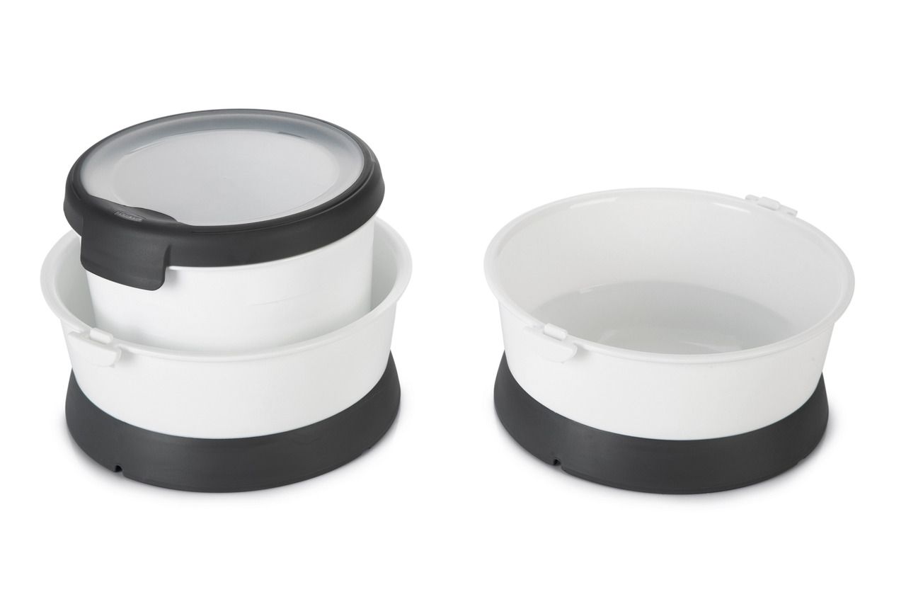 Sie bringt alles mit, was für eine Mahlzeit außer Haus gebraucht wird. Das Set kommt mit einem Napf für Futter, einem weiteren für Wasser und einer Frischhaltedose für die Aufbewahrung des Lieblingsfutters. Die 3in1-Box kann ineinandergesteckt und so platzsparend verstaut werden. Gummikanten an den einzelnen Teilen sorgen dabei dafür, dass alles luftdicht verschlossen wird. So bleibt nicht nur das Futter frisch, aromatisch und knusprig, sondern es treten auch keine Gerüche aus.