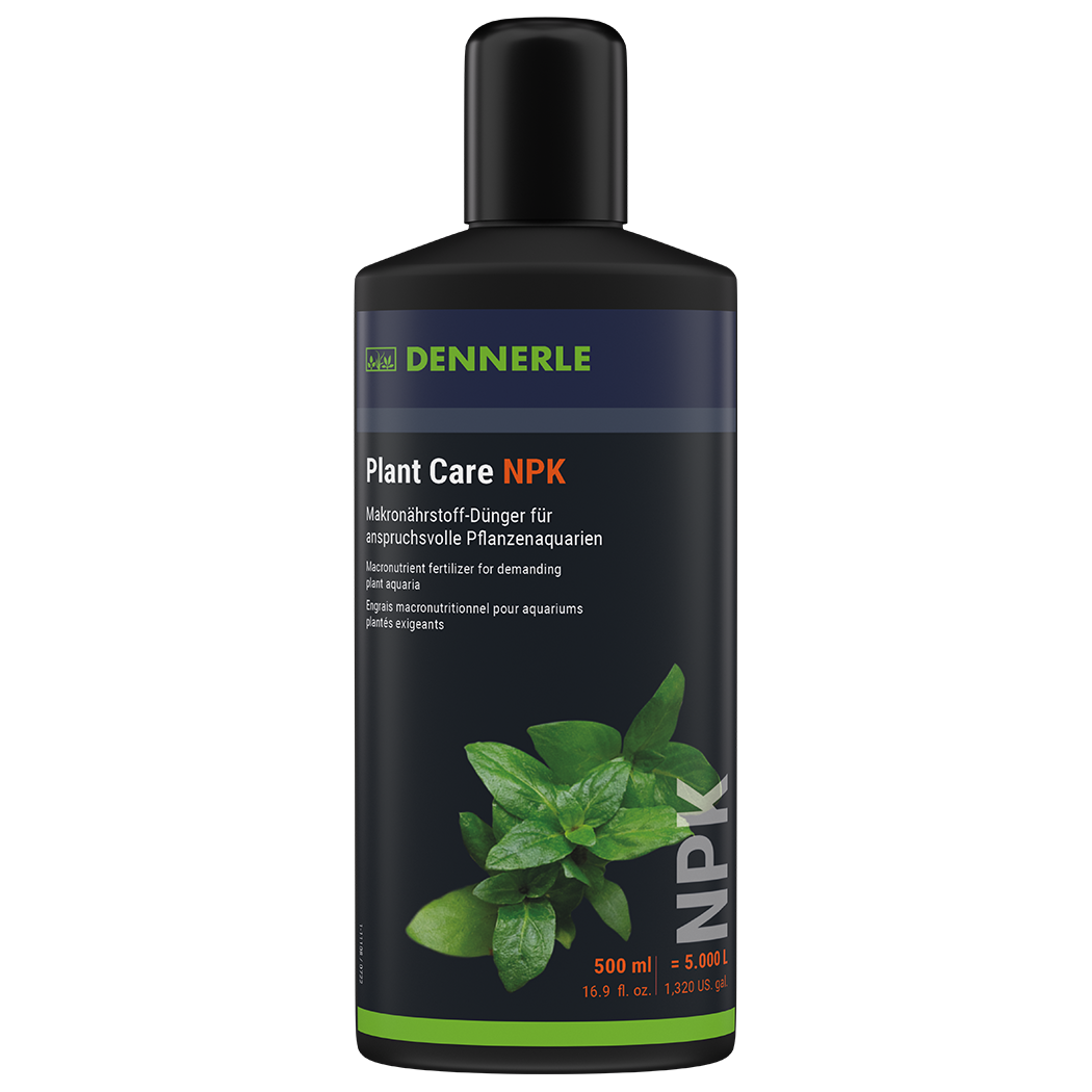 Jedes Aquarium hat einen spezifischen Nährstoffverbrauch in Abhängigkeit von Pflanzenmenge, Pflanzenarten, Tierbesatz, Fütterung, Wasserwechsel und Wuchsbedingungen (Lichtmenge/Beleuchtungszeit, CO2-Zugabe, Filtertechnik, usw.). Die benötigte NPK-Zugabe sollte deshalb für jedes Aquarium individuell ermittelt werden. Plant Care NPK wird nur bei Bedarf eingesetzt, das heißt bei einem echten Mangel an Makronährstoffen. Wir empfehlen den Nitrat- und/oder Phosphat-Gehalt wöchentlich zu messen und Plant Care NPK entsprechend zu dosieren. Man kann auch den Kaliumgehalt des Aquarienwassers messen (Tests im Fachhandel). Diese Messung ist jedoch in der Regel nicht nötig, da durch das Leitungswasser plus Plant Care Pro und Plant Care NPK genügend Kalium zugeführt wird. Eine Überdosierung von Kalium ist in der Praxis kaum möglich und in der Regel nicht nachteilig. Deutliche Überdosierungen von Nitrat und Phosphat dagegen können Algenwuchs fördern. Plant Care NPK sollte deshalb am Anfang nicht ohne vorherige Messung des Nitrat- und idealerweise auch des Phosphatgehalts verwendet werden. Falls das zum Wasserwechsel verwendete Leitungswasser keine außergewöhnlich hohen Mengen an Nitrat oder Phosphat enthält, reicht später in der Praxis die alleinige Messung des Nitratgehaltes als Entscheidungsgrundlage zur NPK-Düngung und –Dosierung aus. Dafür können auch einfache Tauchtests verwendet werden, z.B. der Dennerle WaterTest 6in1.