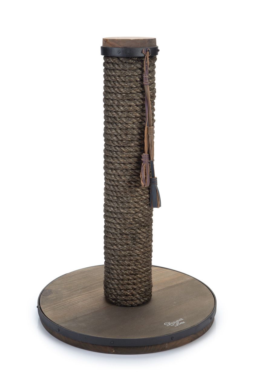 Dieser Kratzbaum aus Holz hat an der Unterseite einen Rahmen aus Metall und ist mit Manila Seil umwickelt. An der Oberseite hat der Kratzbaum drei Troddeln aus Leder.
