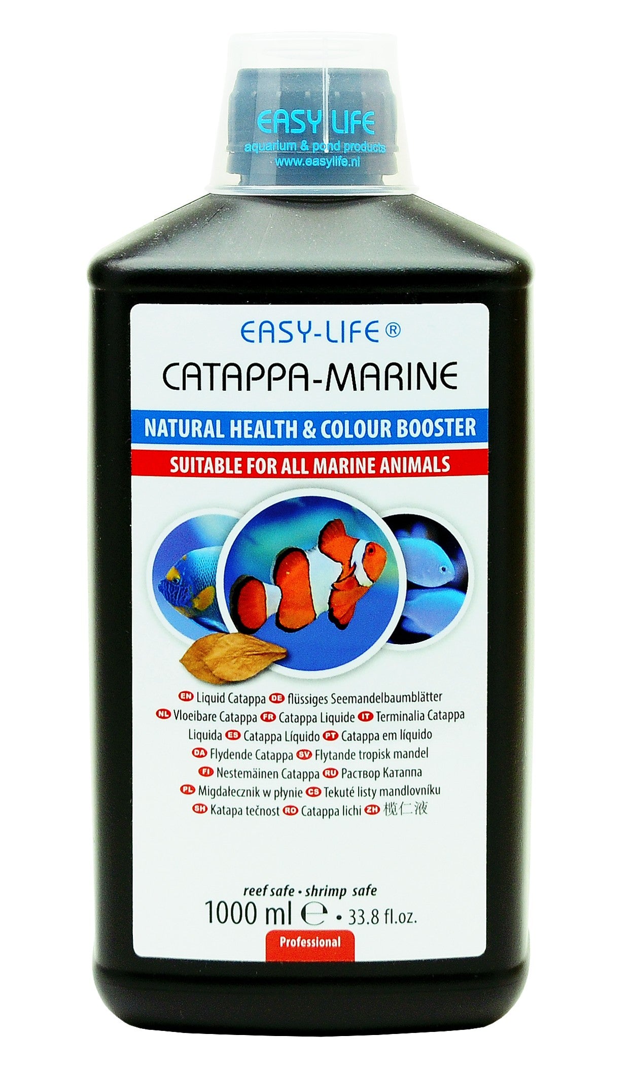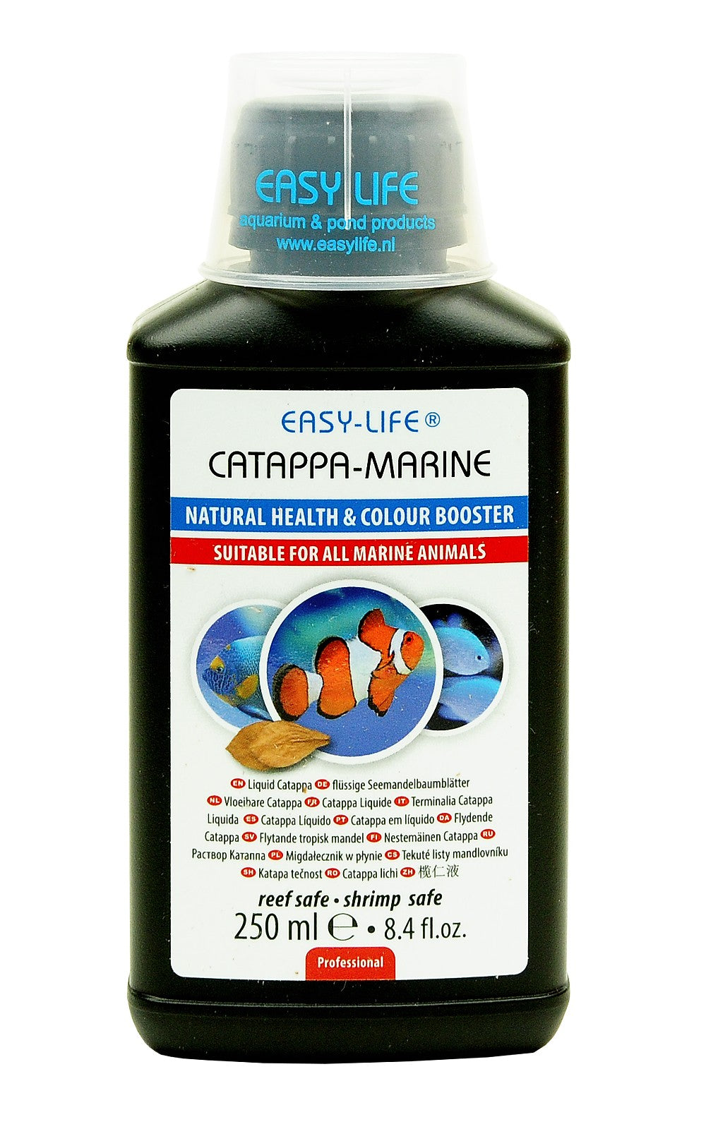 Die Blätter des Seemandelbaums sind für ihre heilende Wirkung auf Fische bekannt: Sie senken die Keimdichte (weniger Krankheitserreger), beugen Pilzinfektionen vor, verbessern das Wachstum, beugen Schleimhautproblemen vor und stimulieren Vitalität und Färbung. Durch ein spezielles Verfahren werden Inhaltsstoffe aus Katappablättern für Meerwasseraquarien nutzbar gemacht. Catappa-Marine verfärbt das Wasser nicht und verbessert sichtbar die Vitalität und Färbung des Fisches.