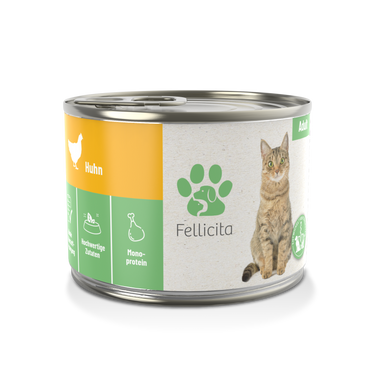 Fellicita: Gesundes Futter – glückliches LebenHuhn pur - Die besonders leckere FeinkostFellicita in Kürze:Konsistenz: besonders leckere weiche PasteteMonoprotein – nur eine FleischsorteHergestellt aus sorgfältig ausgewählten RohstoffenBedarfsgerechte Nährstoffversorgung für erwachsene KatzenRezepturkonzept: Fleisch, Innereien, MineralstoffeAusgewogenes Calcium-Phosphor-Verhältnis 1,2 : 1GetreidefreiOhne künstliche Aroma-, Farb- und KonservierungsstoffeDie Konservierung erfolgt durch Erhitzung in der verschlossenen Dose.Die Sorte Huhn ist in 200 g, 400 g und 800 g Dosen erhältlichVerloren im Futterdschungel? Welches Futter ist wirklich mit hauseigenem Sachverstand und Expertise entwickelt? Bei Fellicita können Sie sicher sein, dass die Rezepturen für Katzen und Hunde aus tierärztlicher Feder nicht nur einmalig nach FEDIAF-Standards konzipiert wurden, sondern auch laufend gemäß aktuellen wissenschaftlichen Erkenntnissen überprüft werden. Das Sortiment umfasst Mono- und Multiprotein-Nassfutter mit kurzer Zutatenliste und transparenten Rezepturkonzepten; hergestellt in Deutschland. Die besonders leckere, weiche und feine Pastete überzeugt auch Gourmet-Katzen. Tierfreunde vertrauen Fellicita, denn: gesundes Futter – glückliches Leben!