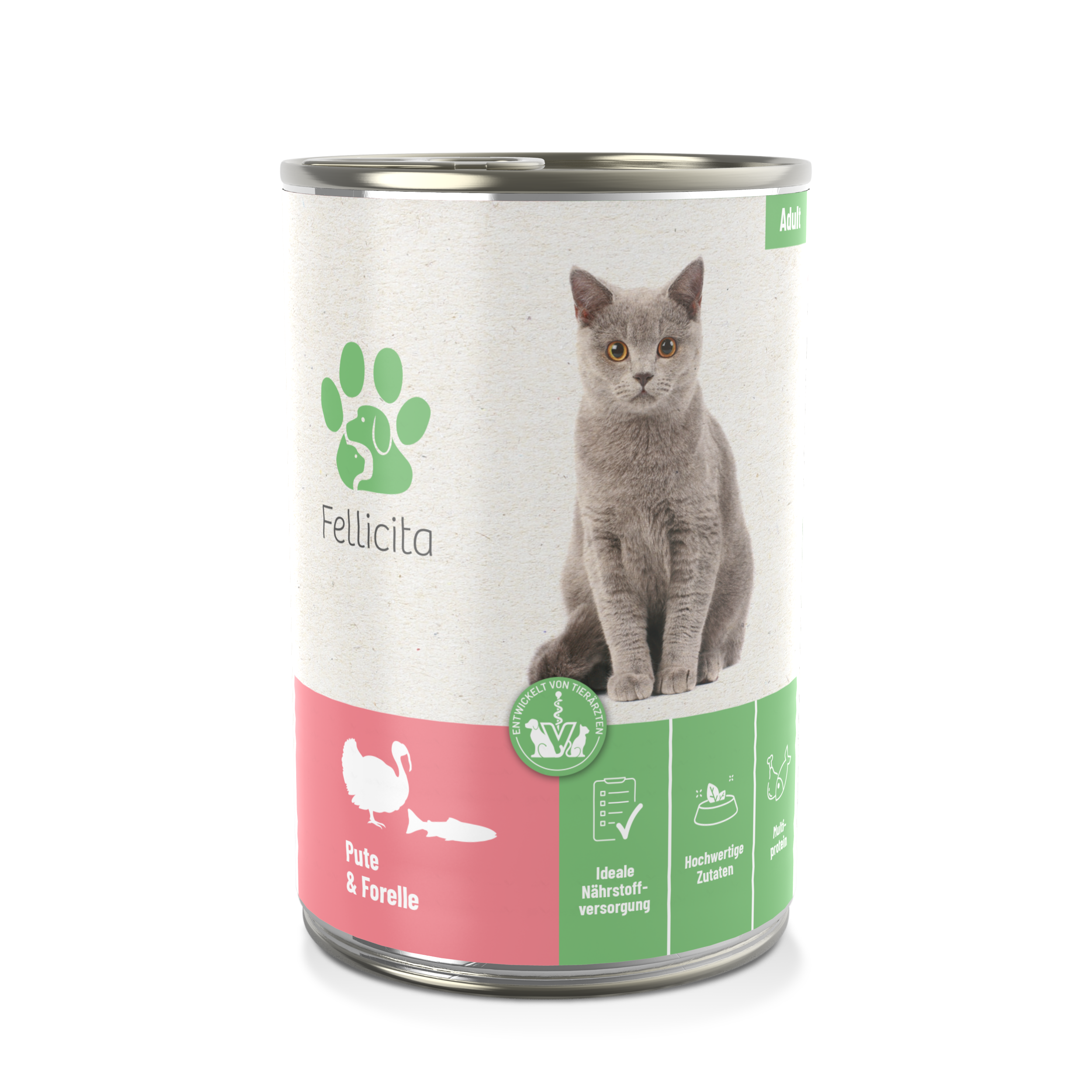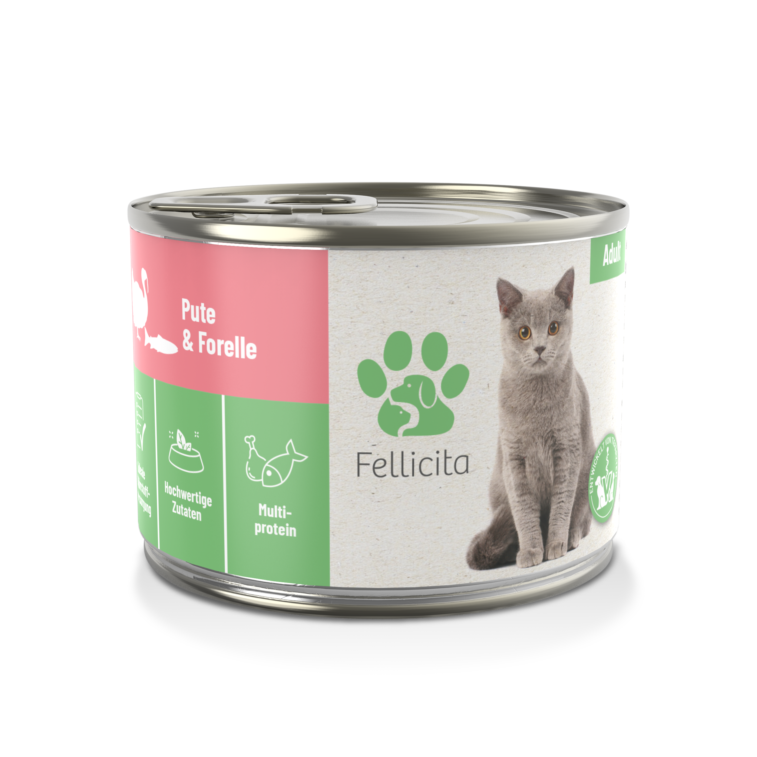 Fellicita: Gesundes Futter – glückliches LebenPute & Forelle - Die besonders leckere FeinkostFellicita in Kürze:Konsistenz: besonders leckere weiche PasteteMultiprotein – Mix aus einer Fleisch- und einer FischsorteHergestellt aus sorgfältig ausgewählten RohstoffenBedarfsgerechte Nährstoffversorgung für erwachsene KatzenRezepturkonzept: Fleisch, Innereien, Fisch, MineralstoffeAusgewogenes Calcium-Phosphor-Verhältnis 1,2 : 1GetreidefreiOhne künstliche Aroma-, Farb- und KonservierungsstoffeDie Konservierung erfolgt durch Erhitzung im verschlossenen Frischebeutel.Die Sorte Pute & Forelle ist in 200 g und 400 g Dosen erhältlichVerloren im Futterdschungel? Welches Futter ist wirklich mit hauseigenem Sachverstand und Expertise entwickelt? Bei Fellicita können Sie sicher sein, dass die Rezepturen für Katzen und Hunde aus tierärztlicher Feder nicht nur einmalig nach FEDIAF-Standards konzipiert wurden, sondern auch laufend gemäß aktuellen wissenschaftlichen Erkenntnissen überprüft werden. Das Sortiment umfasst Mono- und Multiprotein-Nassfutter mit kurzer Zutatenliste und transparenten Rezepturkonzepten; hergestellt in Deutschland. Die besonders leckere, weiche und feine Pastete überzeugt auch Gourmet-Katzen. Tierfreunde vertrauen Fellicita, denn: gesundes Futter – glückliches Leben!