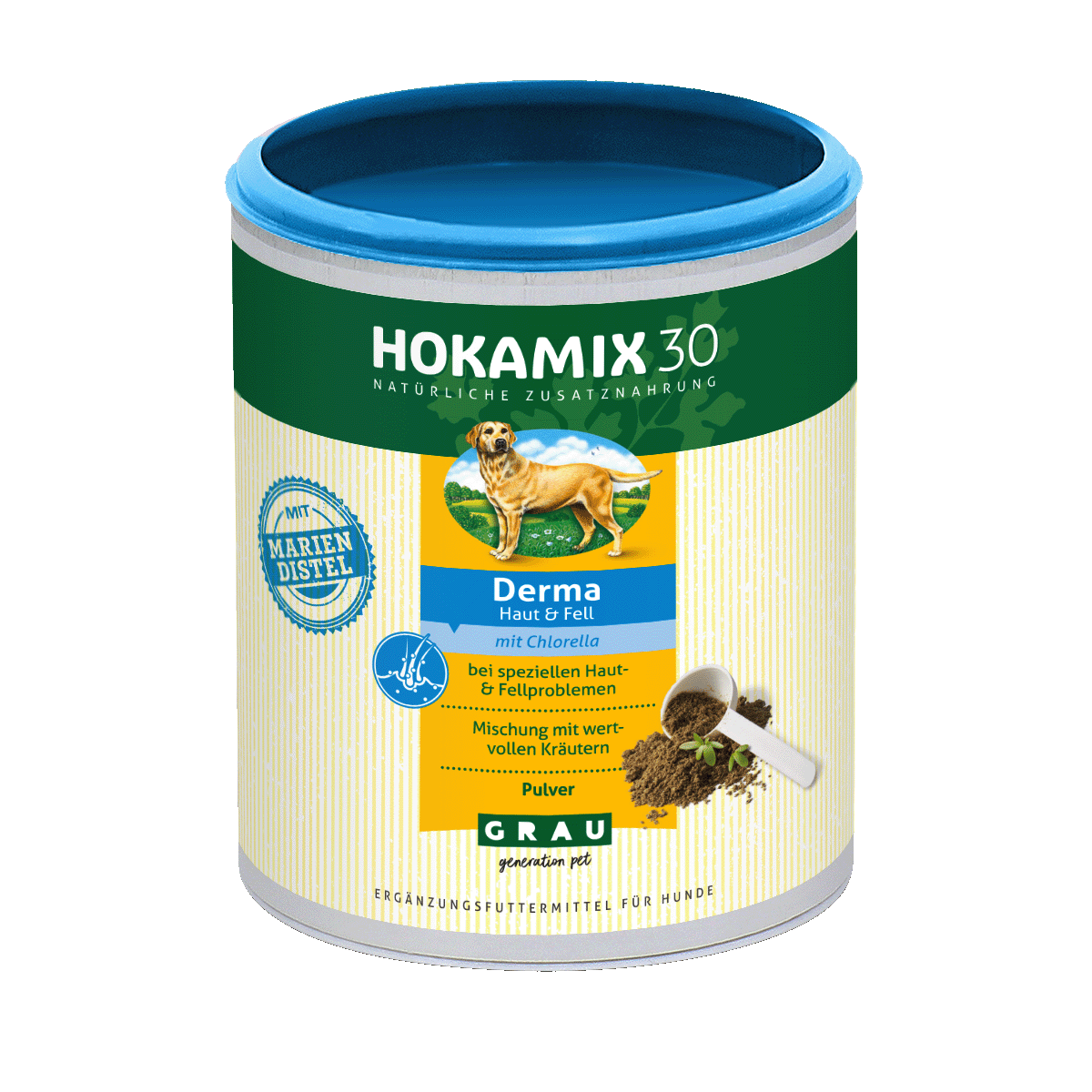 Mit dem Nahrungsergänzungsmittel HOKAMIX30 Derma für Hunde kannst du deiner Fellnase bei starken Hautproblemen helfen und für glänzendes Fell und gesunde Haut sorgen, denn zusätzlich zu unserer Kräutermischung HOKAMIX30, die den gesamten Organismus deines Hunds unterstützt, enthält es zwei weitere Zutaten, die Hautproblemen den Kampf ansagen: Chlorella und Mariendistel.