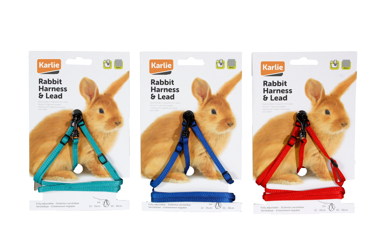 Diese Kaninchengarnitur bestehend aus einem komfortablen Geschirr und einer passenden Leine ist geeignet für alle Kaninchenarten. Sie ist aus robustem Nylon gefertigt und wasserabweisend. Das Geschirr ist stufenlos verstellbar und daher leicht anzupassen. Zwei Klickschnallen ermöglichen ein bequemes und schnelles Anlegen des Geschirrs. Die Leine wird mit einem Karabinerhaken am Geschirr befestigt. In verschiedenen Farben erhältlich. Die Lieferung erfolgt farblich sortiert.