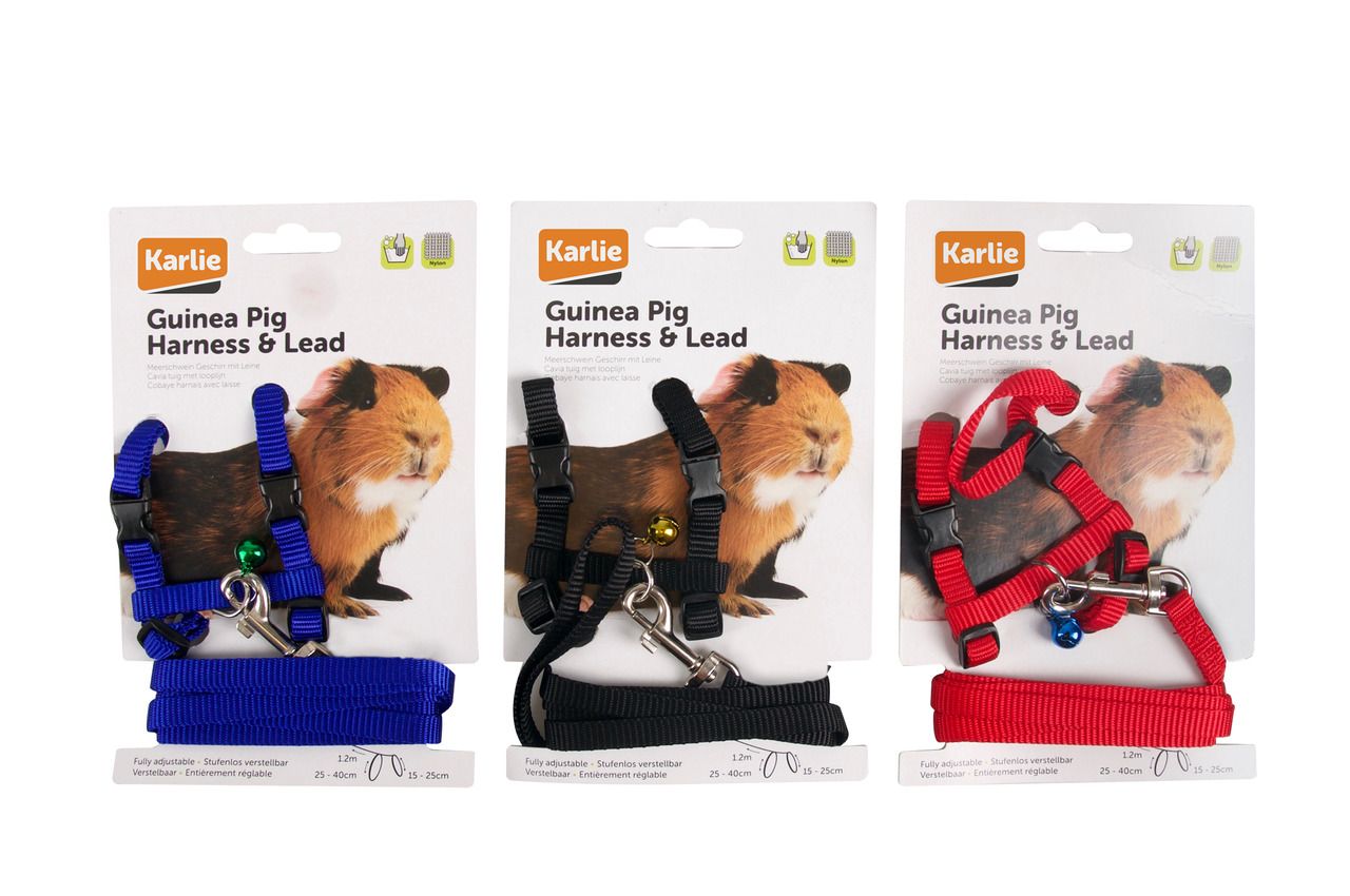 Diese Meerschweinchen-Garnitur besteht aus einem komfortablen Geschirr und einer passenden Leine. Sie ist aus robusten Materialien gefertigt und wasserabweisend. Das Geschirr ist stufenlos verstellbar und daher leicht anzupassen. Zwei Klickschnallen ermöglichen ein bequemes und schnelles Anlegen des Geschirrs. Die Leine wird mit einem Karabinerhaken am Geschirr befestigt. Erhältlich in Rot, Blau und Schwarz. Die Lieferung erfolgt farblich sortiert.