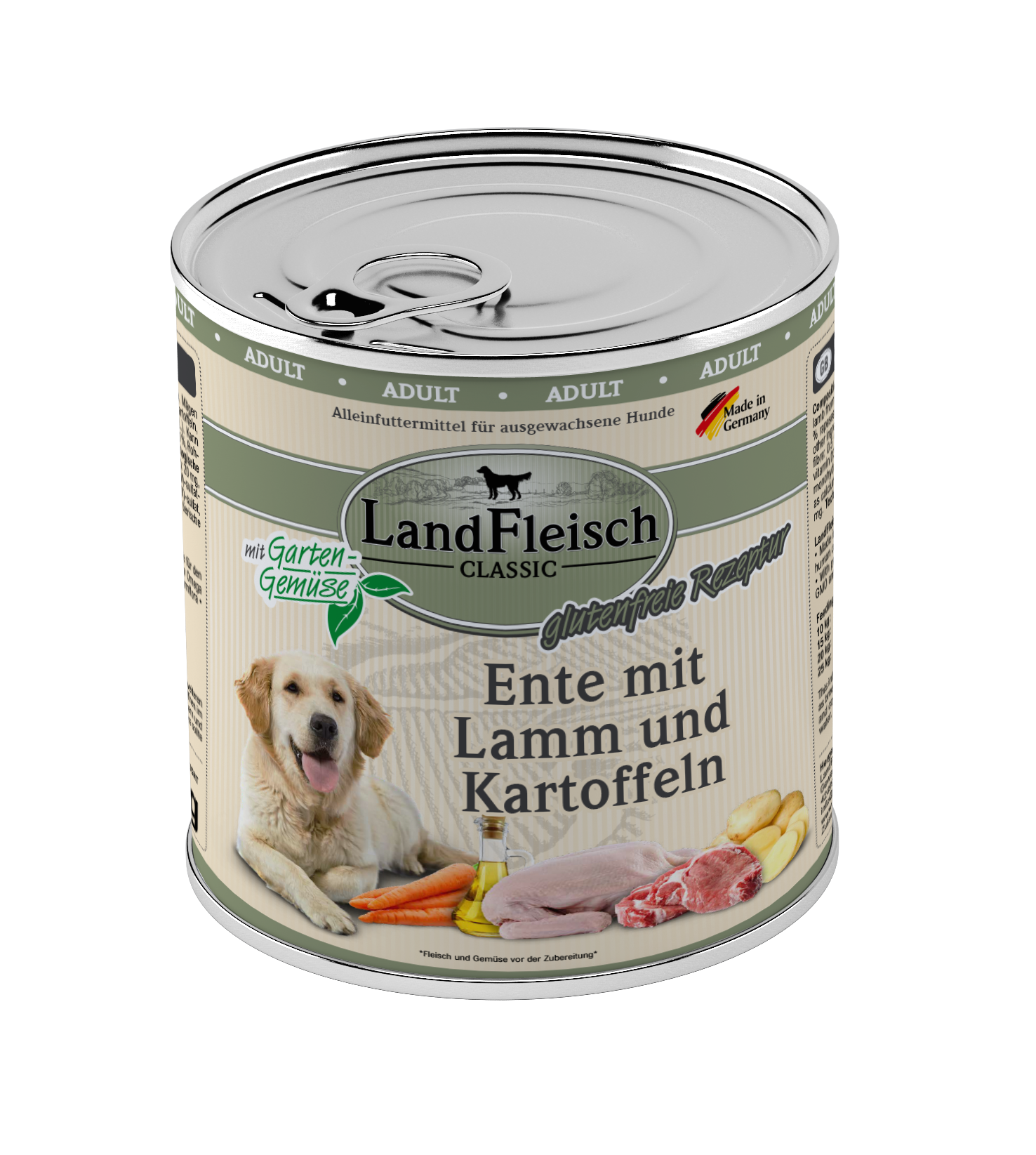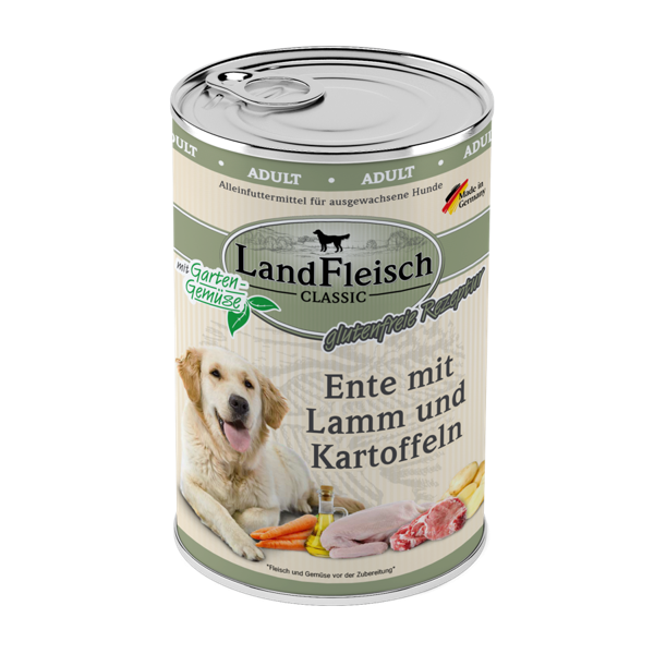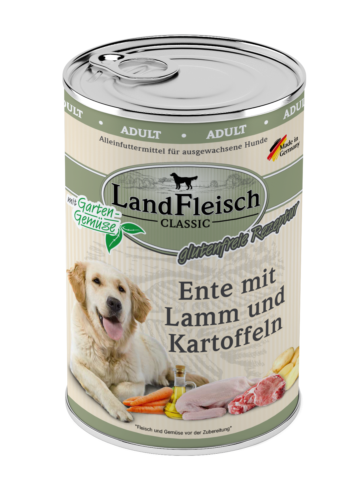 Mit LandFleisch Lamm, Ente & Kartoffeln bietest du deinem Hund ein Nassfutter, das nicht nur köstlich, sondern auch gesund ist – für ein aktives, vitales Leben.