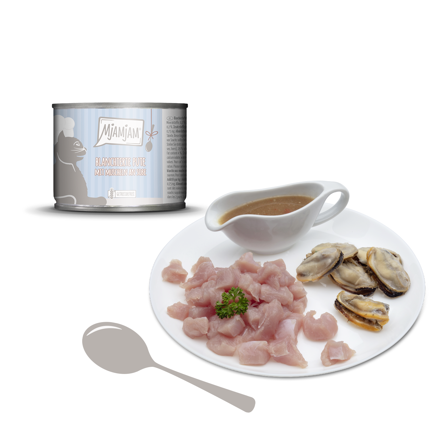 Saftiges Nassfutter für Katzen mit blanchierter Pute und Muscheln in feiner Soße bietet ein getreide- und bindemittelfreies Geschmackserlebnis. Dieses hochwertige Katzenfutter verwöhnt mit extra viel Soße und ist perfekt für alle Katzen, die es gerne saftig und flüssiger mögen. Das getreidefreie Nassfutter sorgt für eine ausgewogene Ernährung mit wichtigen Vitaminen und Mineralstoffen. Ideal für ausgewachsene und ältere Katzen, die Wert auf natürliche Zutaten und hohe Verträglichkeit legen. So wird jede Mahlzeit zum besonderen Genuss – perfekt zum Schlabbern und Verwöhnen.