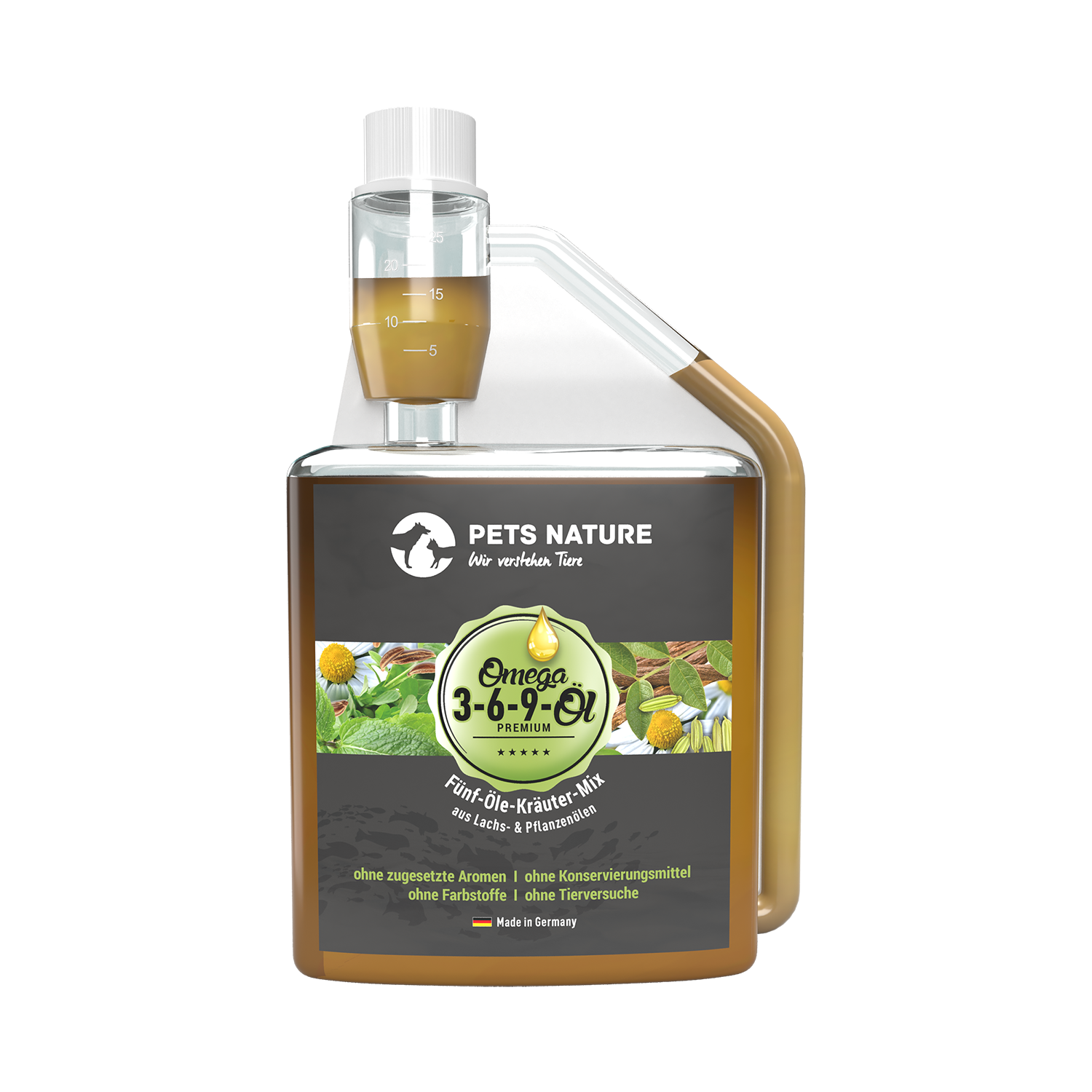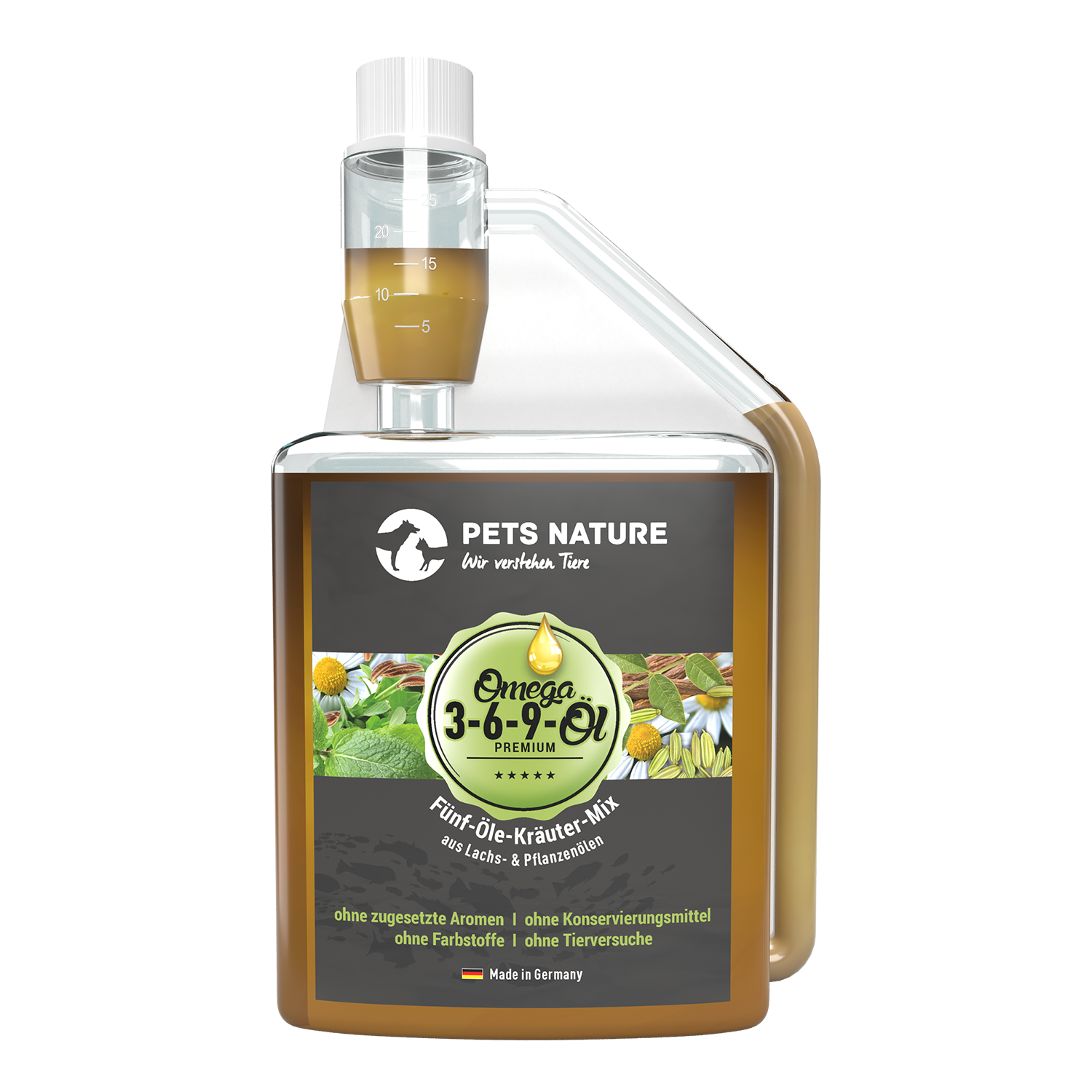 Das PETS NATURE Ölsortiment besteht aus vier hochwertigen Ölen: Lachsöl, Hanföl, Distelöl und Omega 3-6-9 Öl.