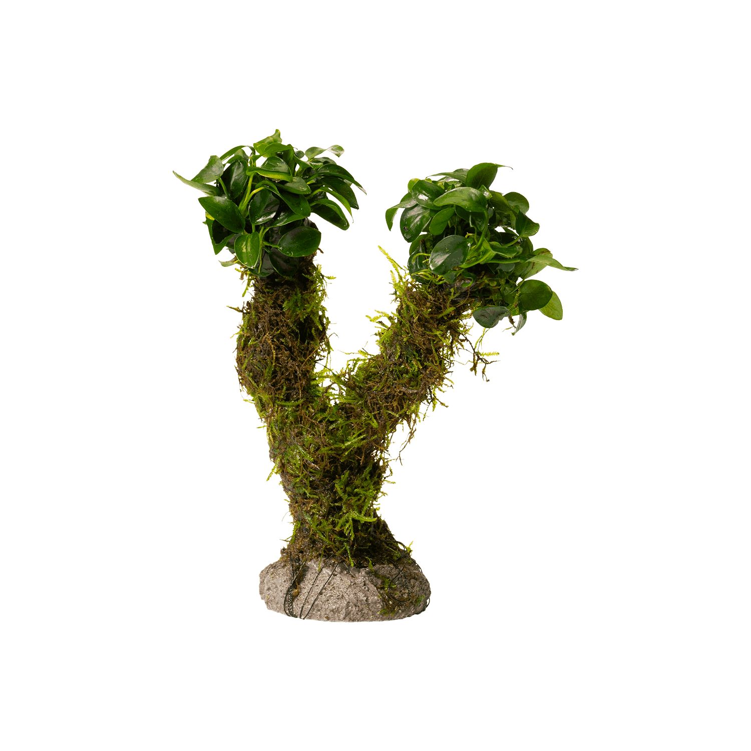 Das Bonsai-Arrangement mit Vesicularia 'Xmas' und Anubias 'Mini' bietet ein harmonisches Design, das einen Miniaturbaum mit einer üppigen Moosdecke und kompakten Pflanzenelementen kombiniert. Die handgefertigte Treibholzstruktur erinnert an einen kleinen Baum, während das 'Xmas'-Moos die Äste umhüllt und eine dichte grüne Krone bildet. Anubias 'Mini' ergänzt das Gesamtbild mit dunkelgrünen Blättern an der Basis. Beide Pflanzen haben ein langsames Wachstumstempo und sind darauf ausgelegt, auf stabilen Oberflächen befestigt zu werden. Das 'Xmas'-Moos stammt aus Südostasien und bevorzugt feuchte, schattige Umgebungen, während Anubias 'Mini' aus Westafrika kommt und entlang von Bächen und Flüssen wächst. Für eine optimale Pflege sind niedrige bis moderate Lichtverhältnisse sowie bestimmte Wasserparameter wie eine Temperatur von 22–28°C und ein pH-Wert von 6,0–8,0 erforderlich. Um die Pflanzen gesund zu halten, sollten regelmäßige Pflege- und Wartungsmaßnahmen wie das Zurückschneiden von 'Xmas'-Moos und die Reinigung der Anubias-Blätter durchgeführt werden. Beide Pflanzentypen sind epiphytisch und wachsen natürlicherweise auf Oberflächen, was sie besonders geeignet für Aquascaping macht.