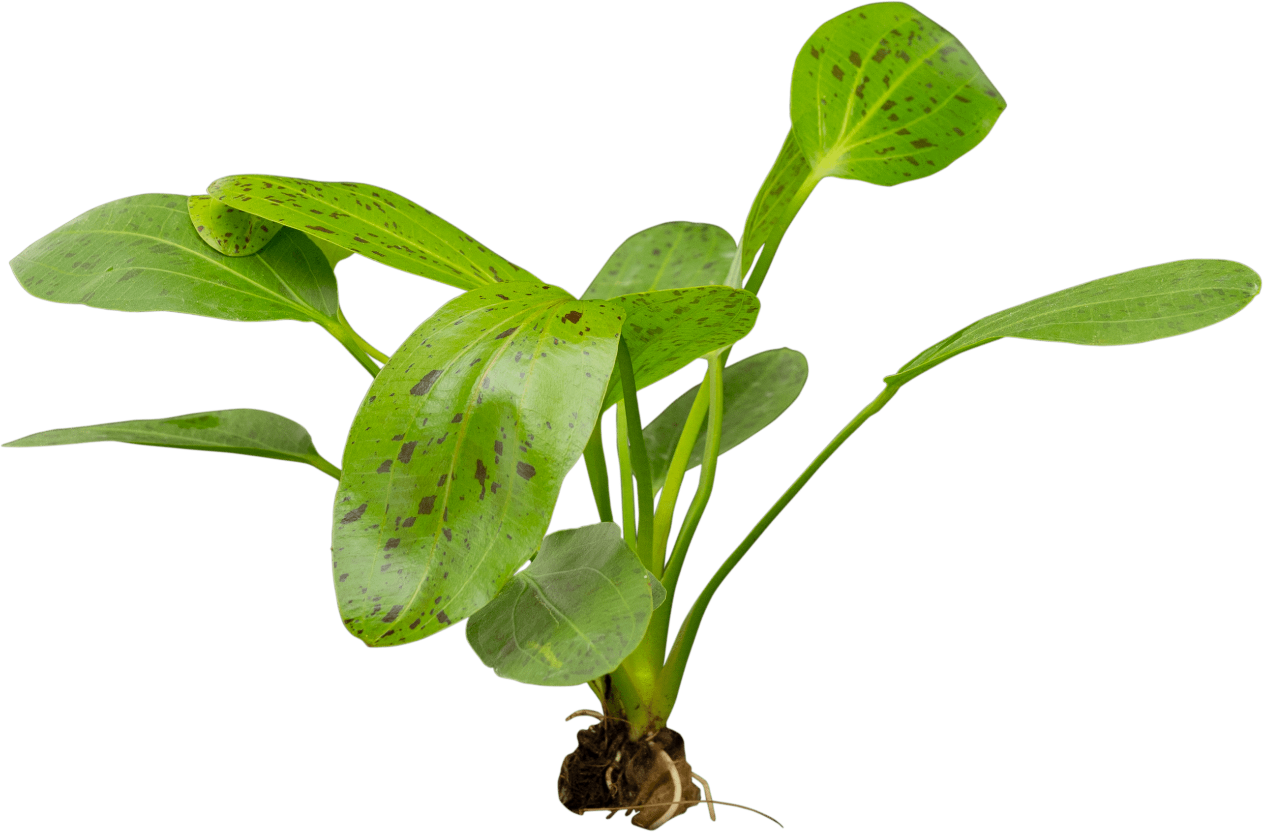 Echinodorus 'Ozelot Green' ist eine robuste Schwertpflanze mit auffälligen, rotbraunen Flecken auf den Blättern. Die Grundfarbe der Blätter variiert von hell- bis mittelgrün, was ein kontrastreiches Aussehen erzeugt. Ähnlich wie Echinodorus 'Ozelot' hat diese Sorte schmale, elliptische Blätter, die am Rand gewellt sind. Die Blattrosette erreicht eine Höhe von etwa 40 bis 50 cm und eine Breite von bis zu 40 cm.