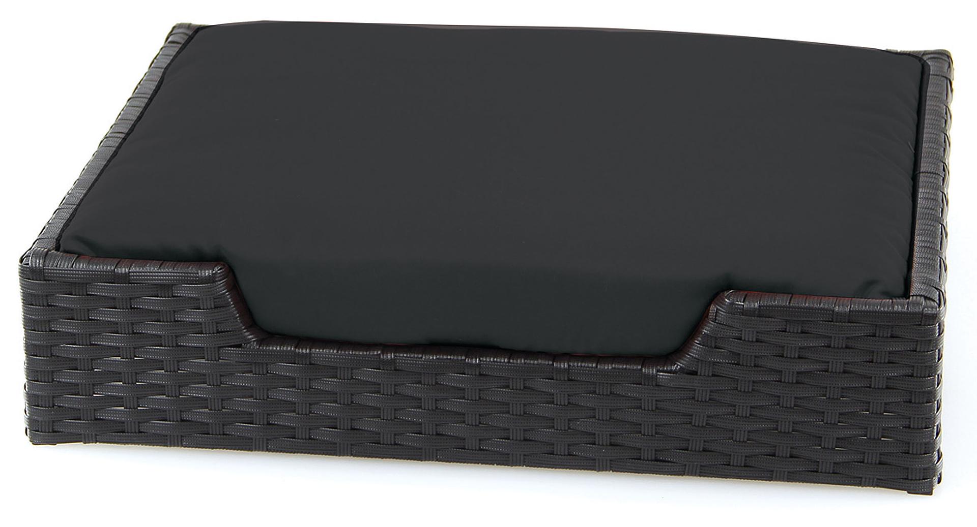 Das Kissen wird umfasst von einem Korb aus schwarzem Rattan-Imitat was dem Bett einen schlichten aber doch schicken Look verleiht.