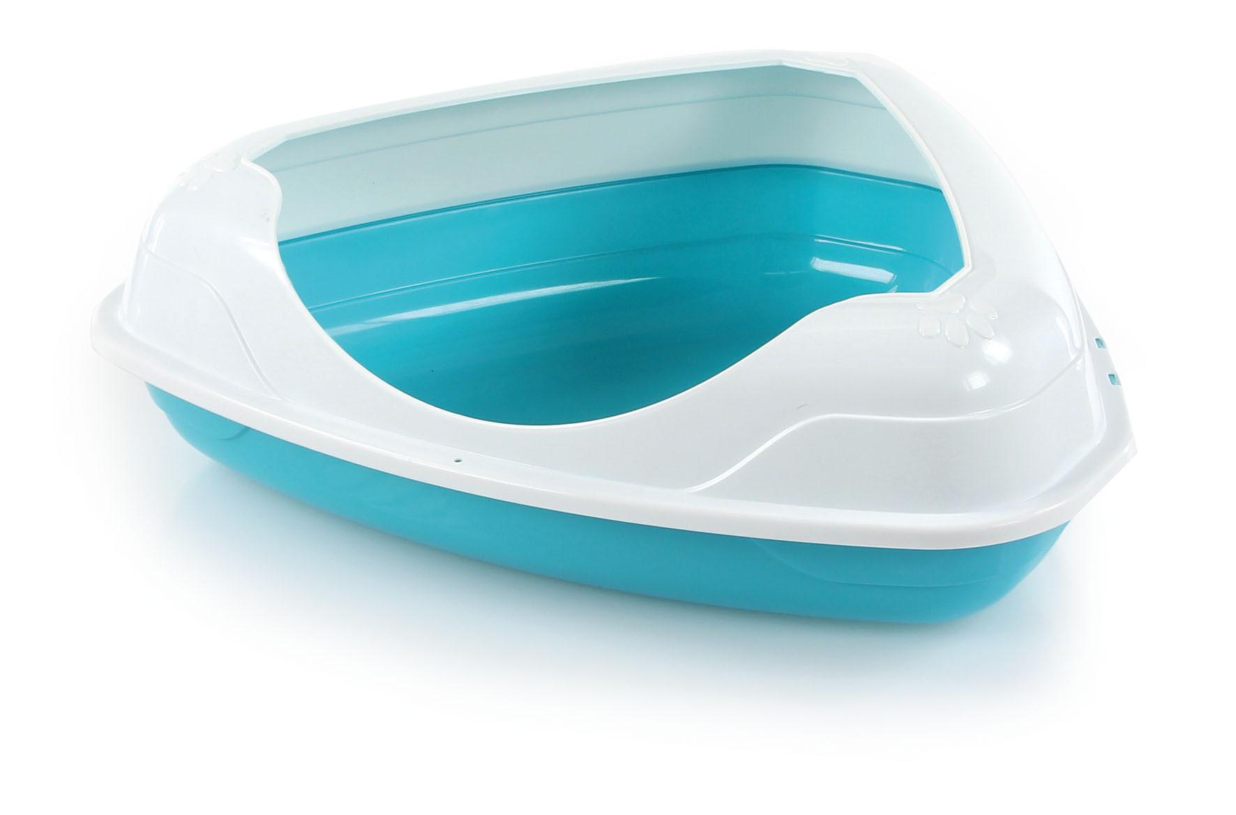 Praktische Eck-Katzentoilette in trendigem türkisblau, die sich sehr gut in einer Ecke platzieren lässt und somit platzsparend ist. Mit extra hohem Rand als Spritzschutz.