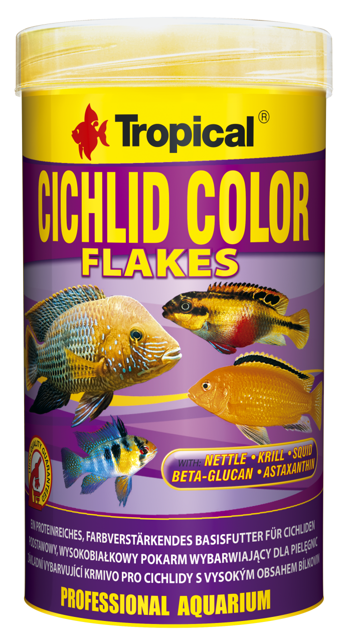 CICHLID COLOR FLAKES ist ein proteinreiches, farbverstärkendes Basis-Flockenfutter für die tägliche Fütterung alles- und fleischfressender Cichliden, darunter auch viele Arten von Malawisee-Cichliden.